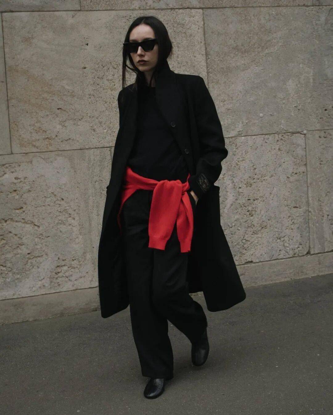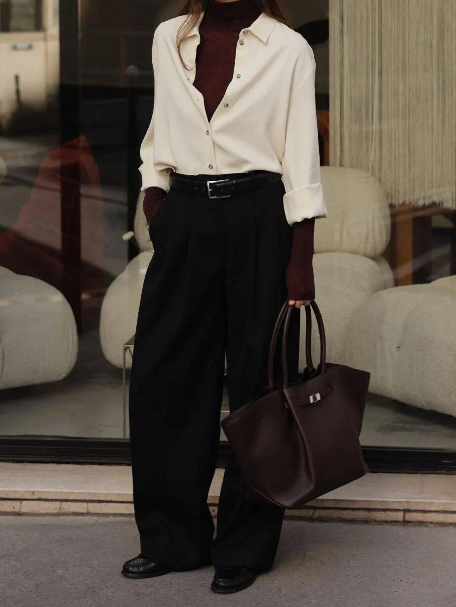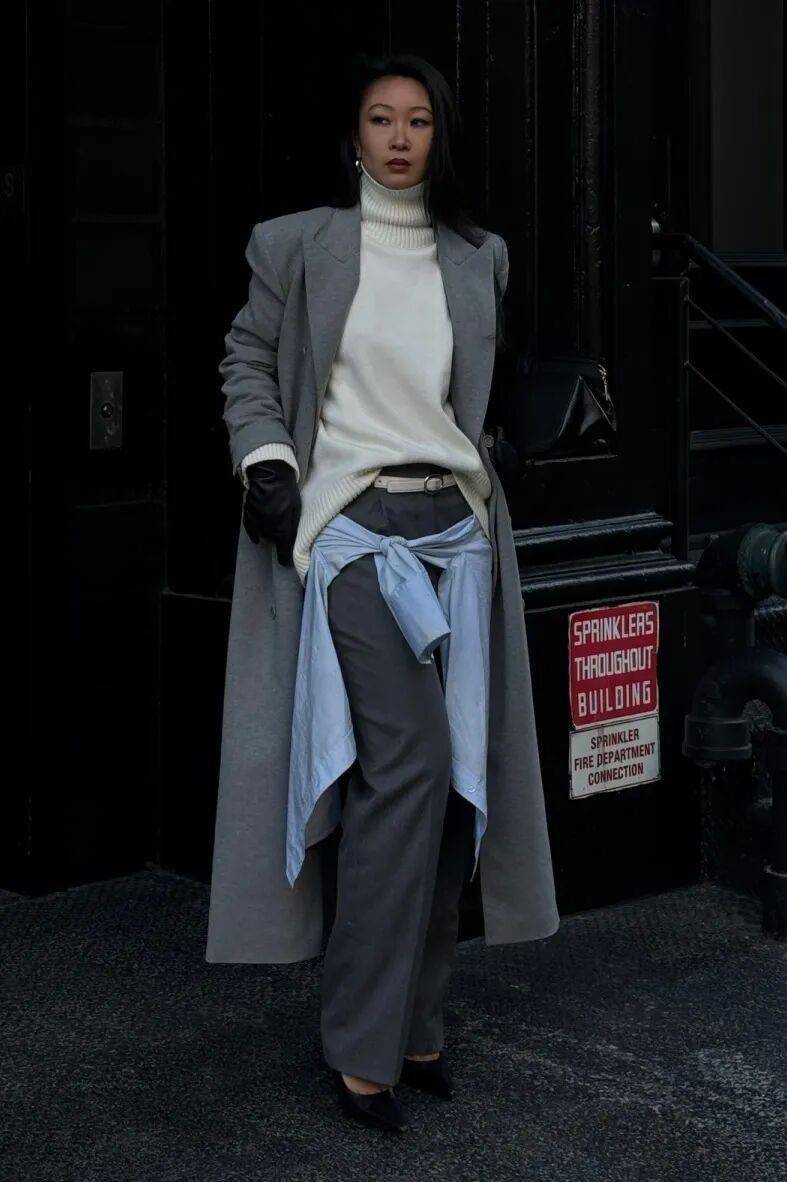 细节:袖口露出内搭领口,下摆塞进裤腰,系一条细腰带(与大衣同色),沉稳气质,适合职场。