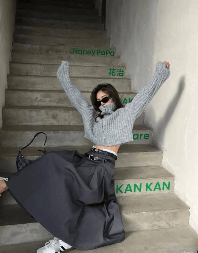 内搭短款/塞下摆:选短款中层单品(如短款针织开衫),或把内搭下摆塞进裤腰(如高领打底衫塞到牛仔裤里),露出腰腹位置,配合外层长款外套,形成“高低层次”,显高显瘦。