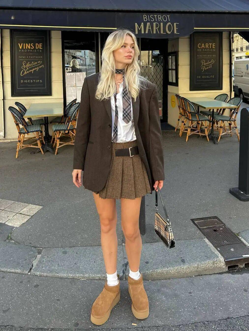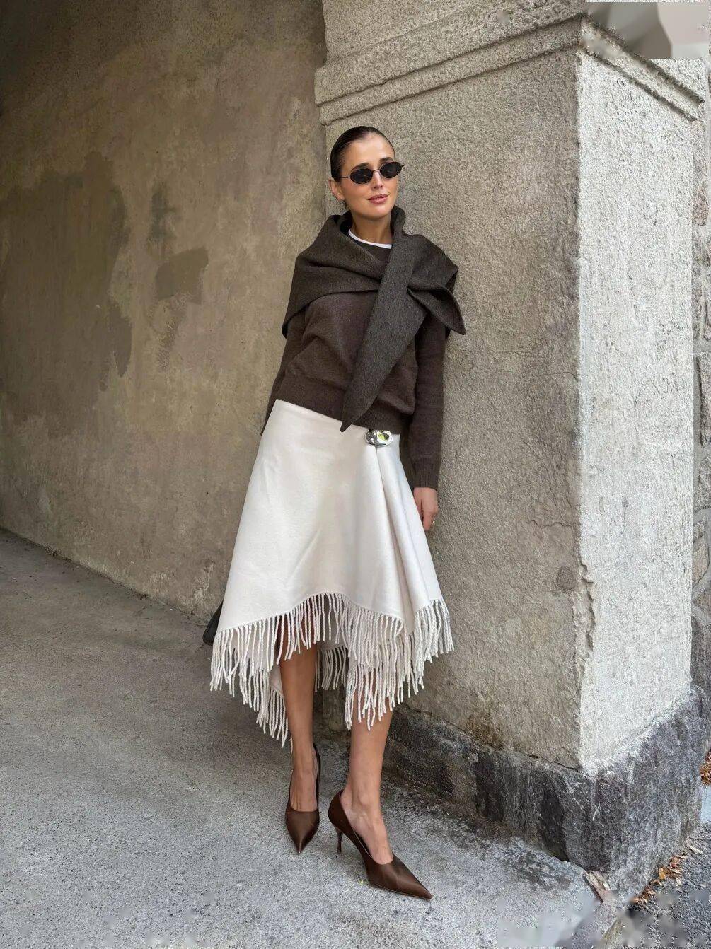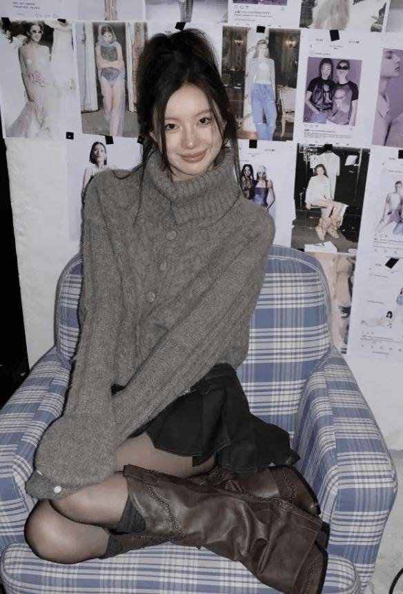 内搭:紧身羊毛毛衣(深棕/栗子色,贴合身形);