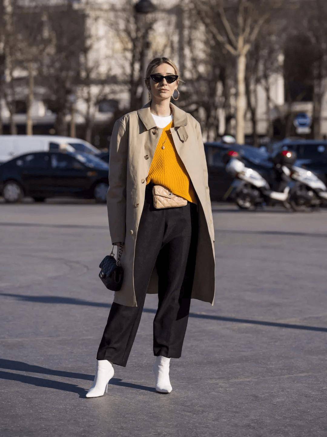 例:紧身羊毛毛衣+麂皮马甲(到腰腹位置,突出腰线)+ 长款风衣(垂坠感),既保暖又能藏住腰腹赘肉,同时强调身材曲线。