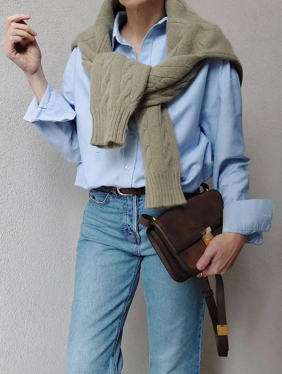 软硬对比:软材质(如羊绒衫)+ 硬材质(如牛仔衬衫),例:软糯羊绒衫+ 挺括牛仔衬衫+ 垂坠呢子大衣,既有温度又有风度,避免软材质贴肤显胖。