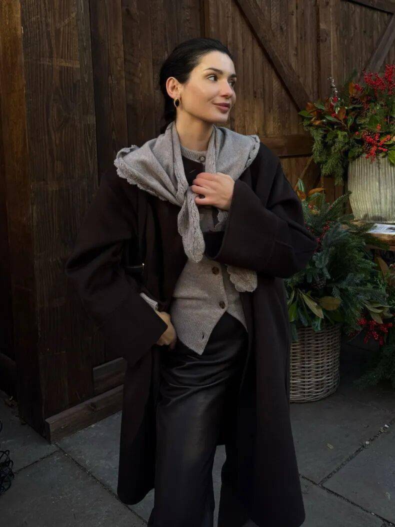 薄厚对比:内层薄(如真丝打底)+ 中层适中(如羊毛针织)+ 外层厚(如毛呢大衣),例:真丝打底+羊毛马甲+ 大衣,柔软与硬挺结合,保暖又不臃肿。