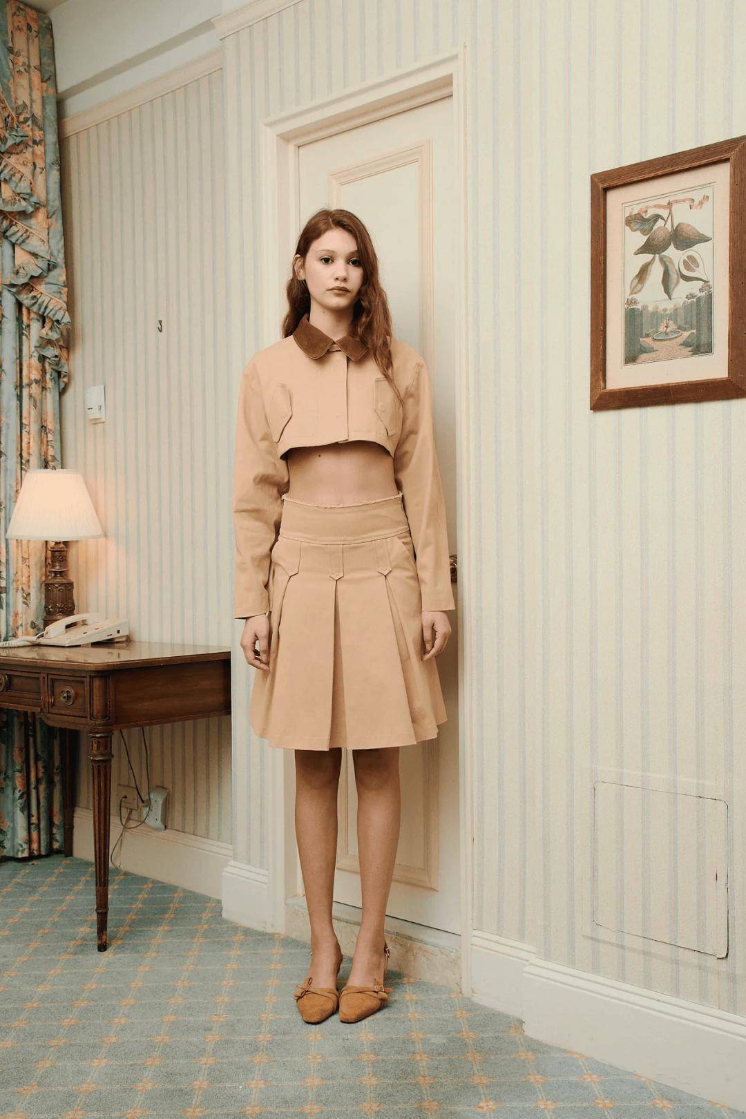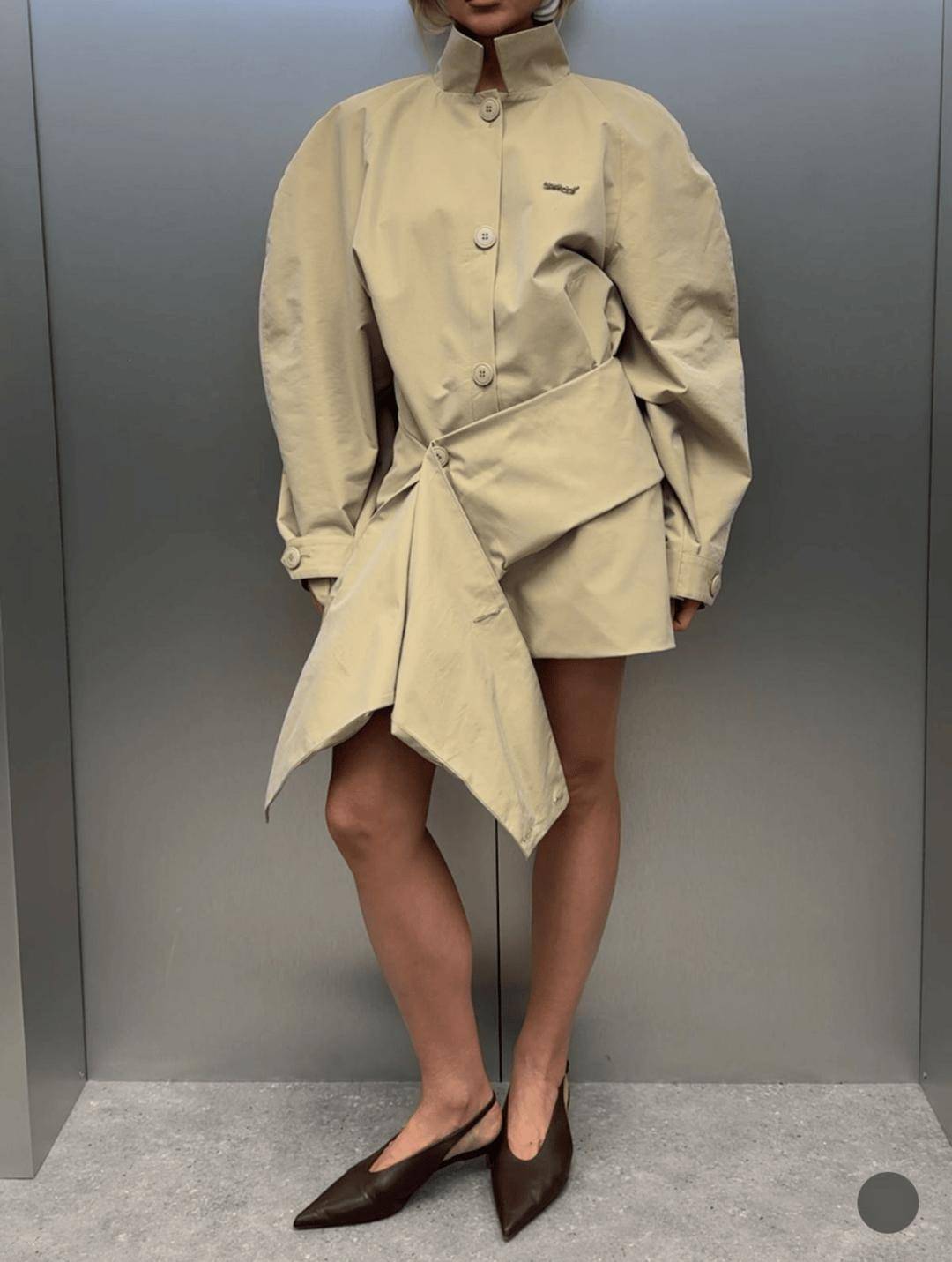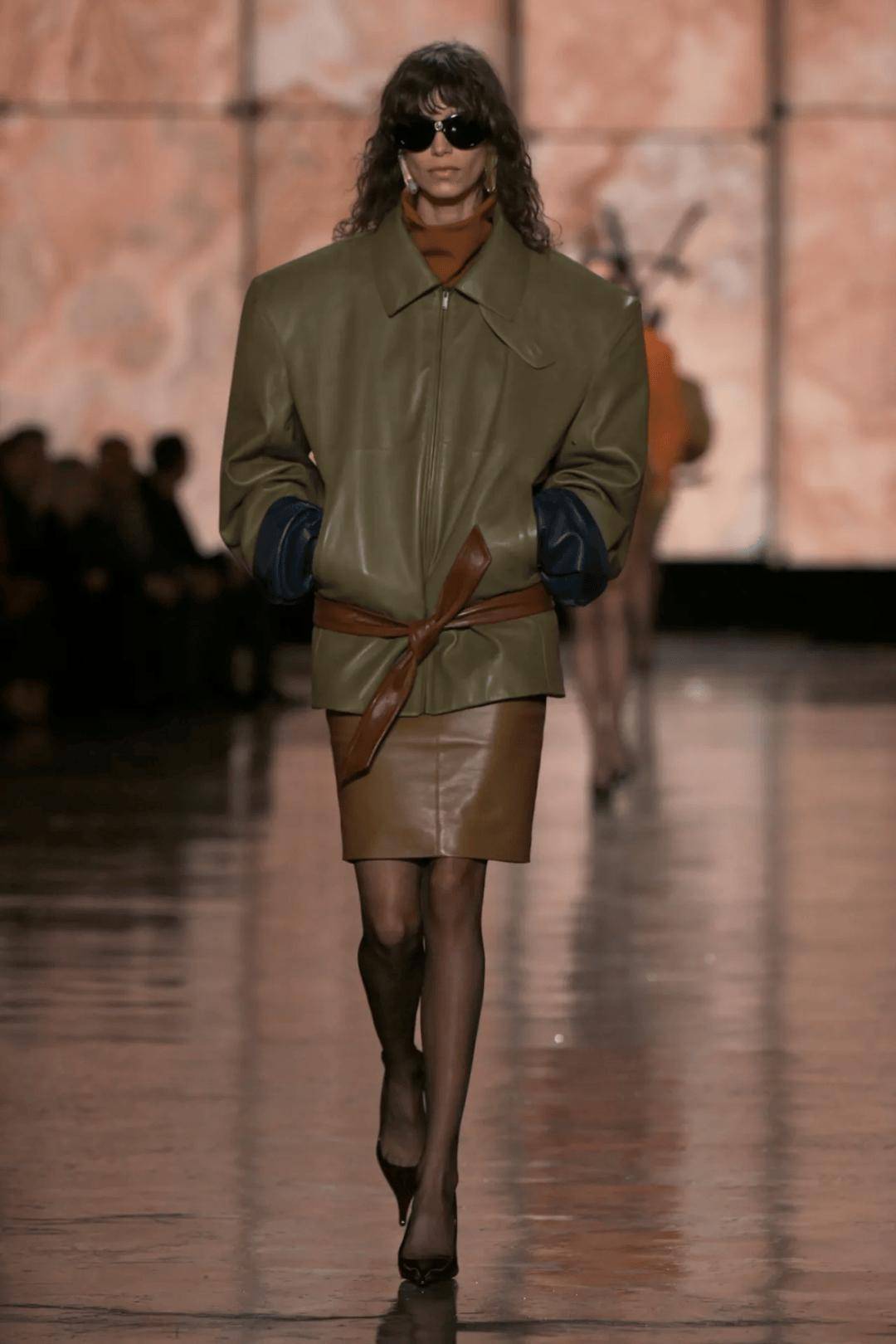 保留军装风、金属配饰等象征权力的历史符号,但通过缩小比例、圆润边缘或结合天然材质(如木质纽扣、丝绒领口)进行柔化,使整体更具人文温度。