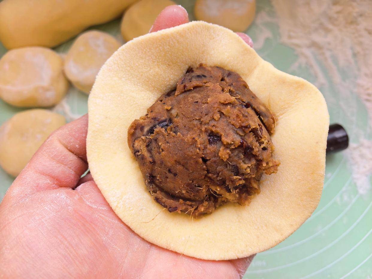 3、揉好的面团搓成长条,分成均等大小的面剂子,擀成中间厚边缘薄的面片,包入红豆红薯馅儿,收好口。