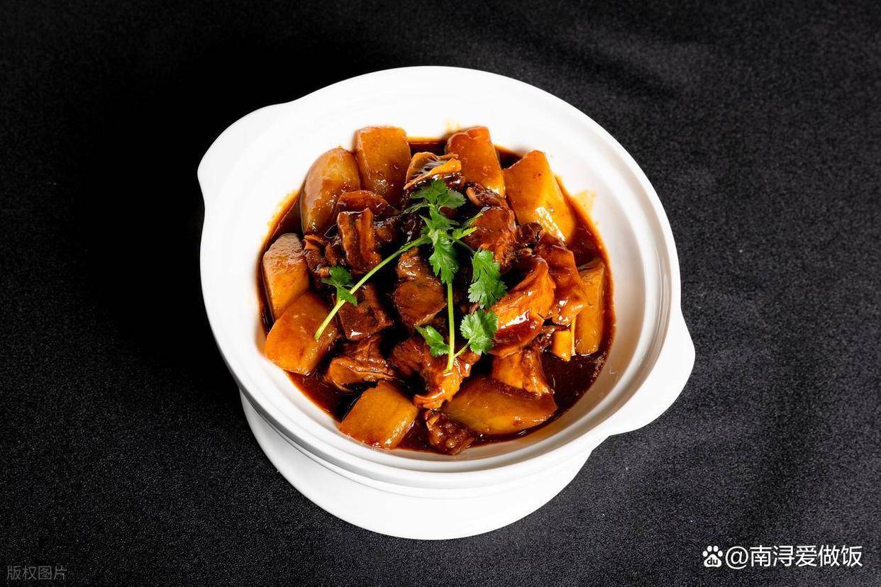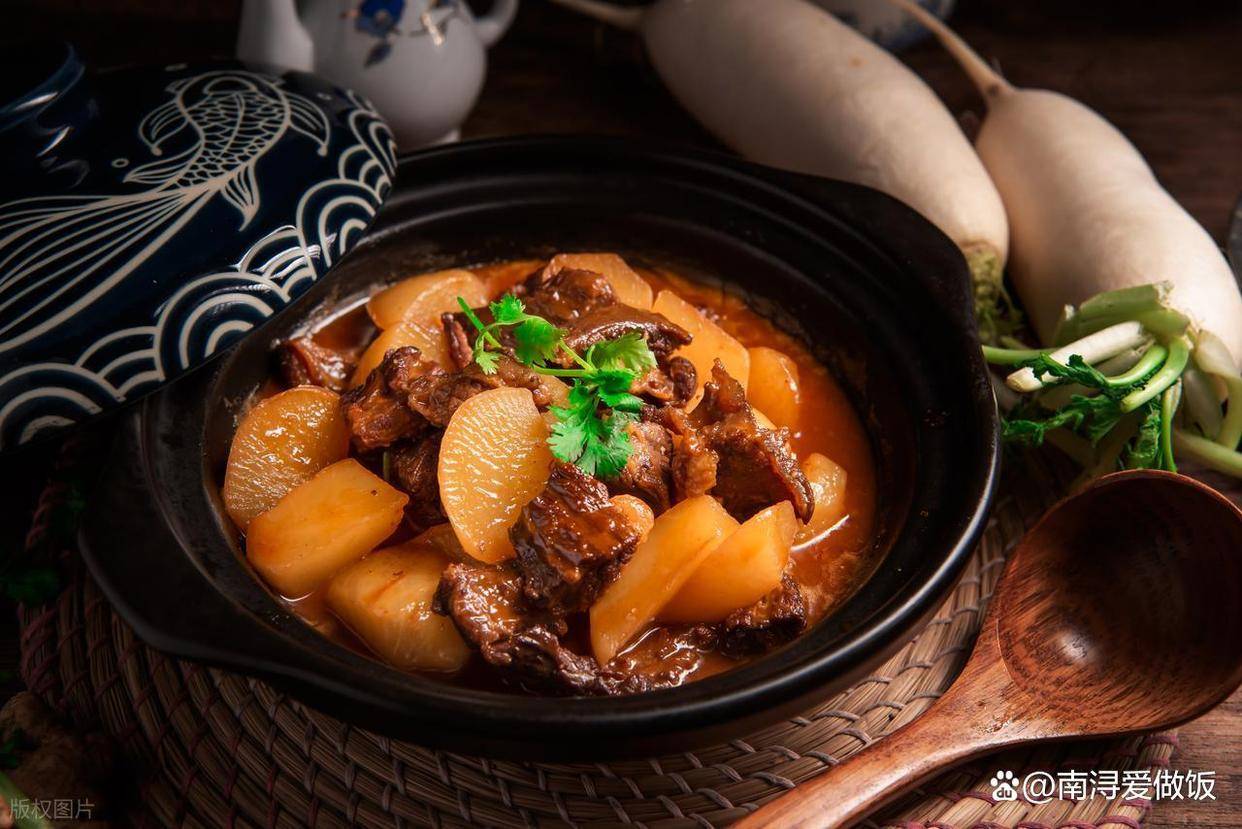 6. 加入萝卜块,继续小火30分钟,直到萝卜透明、牛腩酥烂。