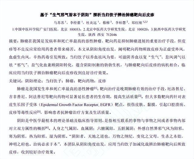 马苏苏,基于“生气邪气皆本于阴阳”探析当归饮子辨治肺癌靶向后皮疹[J/OL].中医学报,[2024-09-13].