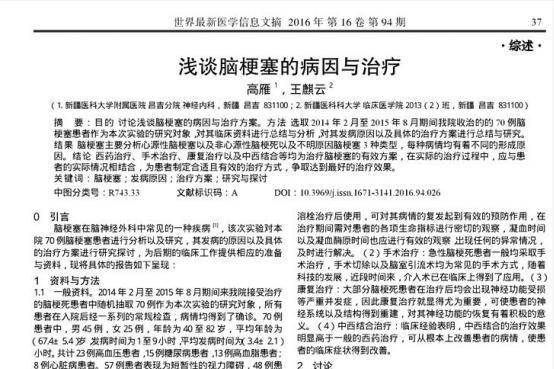 [1]高雁,王麒云.浅谈脑梗塞的病因与治疗[J].世界最新医学信息文摘,2016,16(94):37.