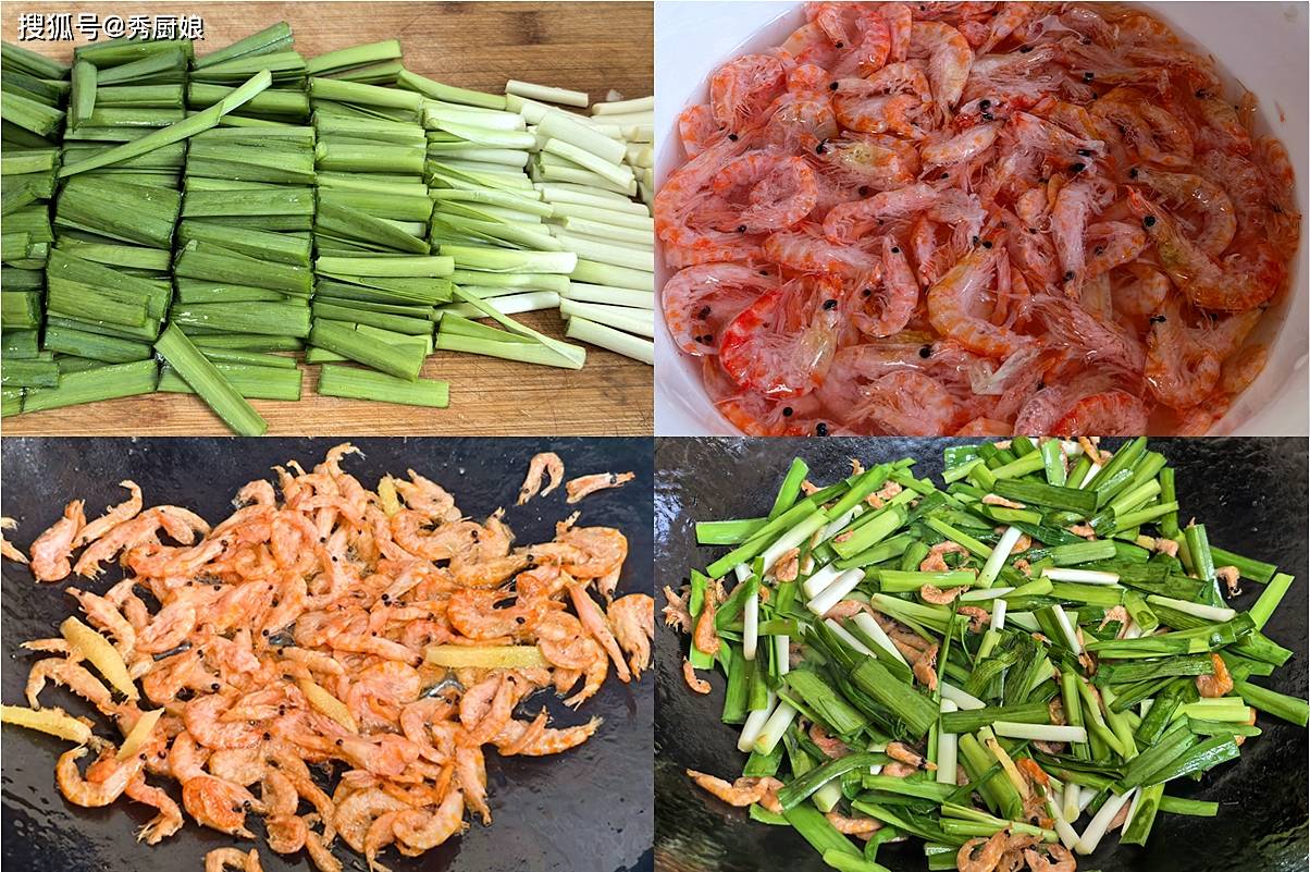 3. 先下韭菜根部,快速翻炒十几下,接着倒入虾皮和韭菜叶。