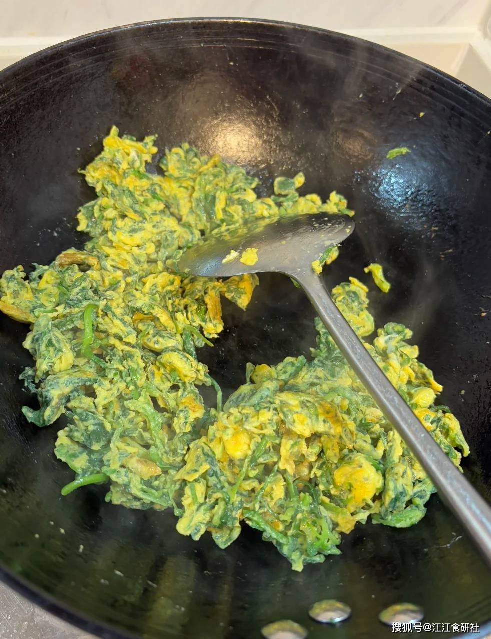 先静置3秒,让底部形成一层金黄的脆壳。然后用筷子快速划散,让蛋液包裹着荠菜在热油中迅速凝固。