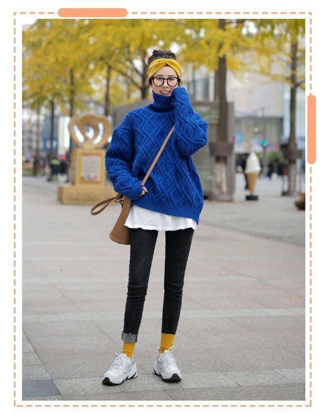 这身叠穿相对来说简单多了,也超级好模仿借鉴,蓝色的毛衣视觉感很强,电光蓝一下子就能吸引你的眼球,加上菱格纹的设计,让毛衣更具细节看点。穿这种宽松毛衣的时候,最怕的是显得臃肿和老气。而在内搭上玩点小心机,用白色的打底衫来衬托,可以轻松打造出层次感,白色衣摆也很显眼,和蓝色配在一起,蓝白配给人小清新的视觉感。搭配黑色九分裤,露出黄色的袜子,和衣身形成鲜明的撞色,回头率超高。