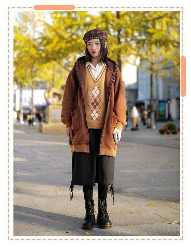 应该说这身造型是比较复古时髦的,而且在大街上也不容易看到,特别是这件外套,棕色加上中长款的样式,一般人穿上都会觉得有点拖沓,它对身材来说并不友好,即使是运动风的款式,整个样式还是显得有些老气了。但在内搭上选择白衬衫配菱格针织背心,这样搭配减龄效果满分,一下子把外套的老气感给弱化了。下半身穿五分短裤,看起来更加简洁,和上身的繁杂感中和,整体繁简有序。