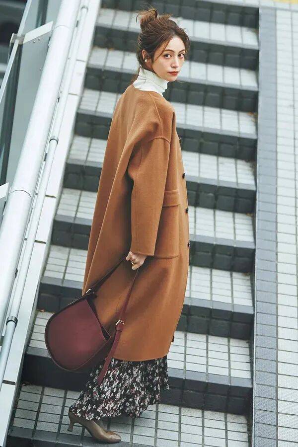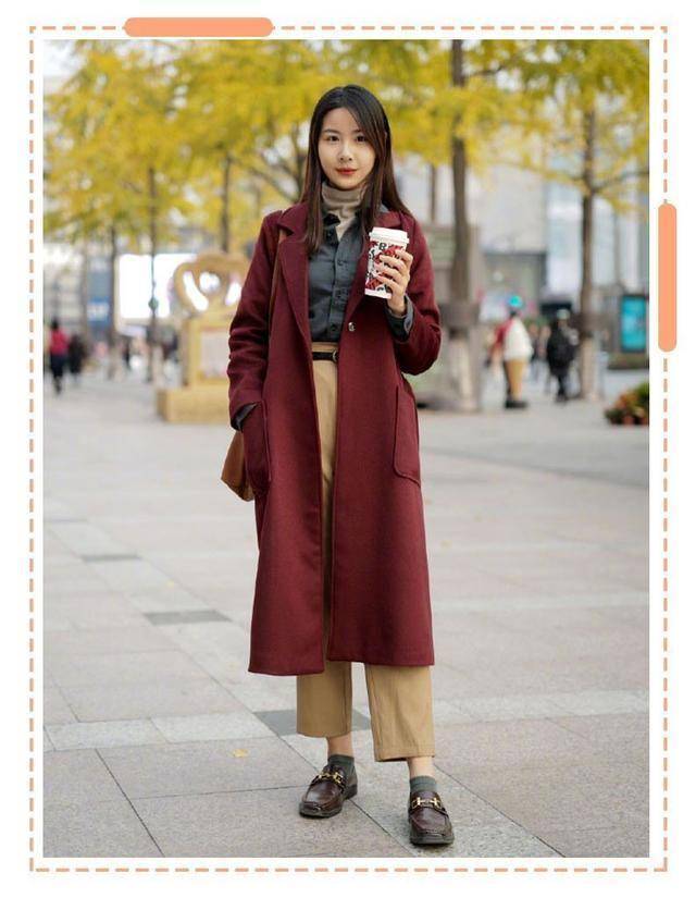很多人对酒红色的外套也不敢穿,觉得它属于妈妈的年龄,不适合年轻人穿。这身一种误解,酒红色是非常衬显出色白皙的色调,而且很容易体现一个人的内涵和衣品。这次就拿这件酒红色呢大衣来搭配,小翻领结合简洁的设计,看起来毫无亮点。内搭上穿燕麦色打底衫,露出堆堆领,不仅保暖还显得端庄温婉很多。为了避免整身颜色过于复杂,衬衫选了黑色调,稍微低调些。下半身的裤子是驼色系,也是非常显高级的色调。