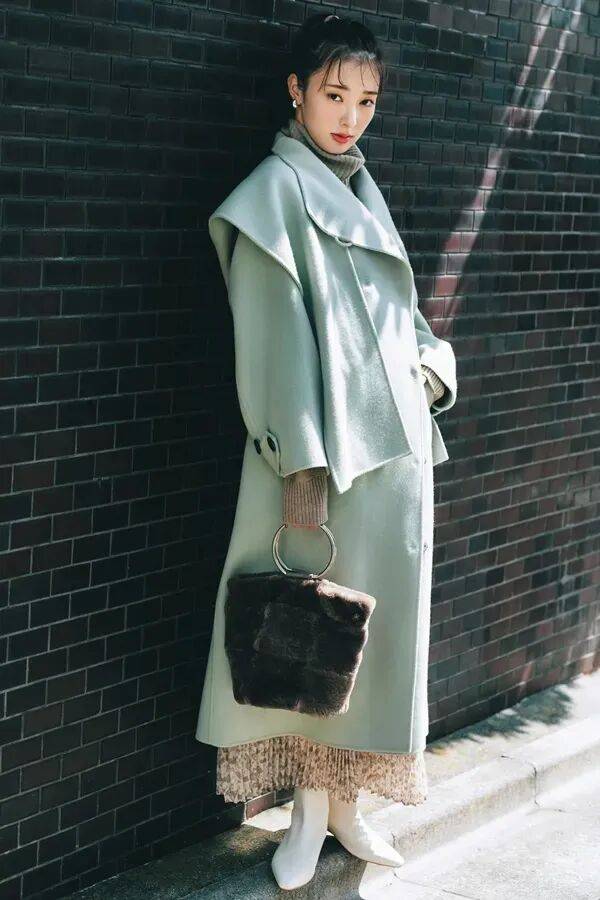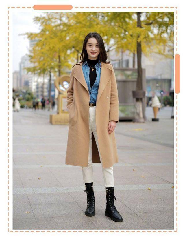 我们很少会买这么短款的呢大衣,虽然属于长款里,也算是长款里的短大衣了,穿上总觉得买小的感觉。这样的大衣单看好像有点过时了,而造型成功完全依靠它的内搭,黑色打底衫,就好像绘画的时候已经打好底色了,然后配上牛仔衬衫和白色牛仔裤,蓝白配色看上去干干净净的,也让沉闷的冬日变得有色彩多了。最后用一双系带马丁靴来点缀,整体造型叠穿有序,不乱又吸睛。