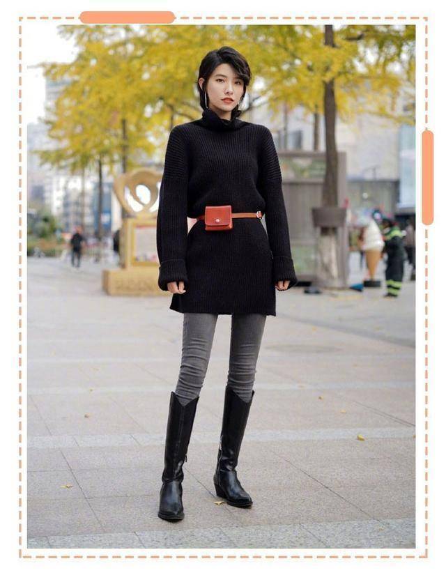 都说一身黑色的造型很酷很炫,穿上黑色的毛衣后,中长款的版型设计要是直接套上穿出去就会显得不伦不类,好像是毛衣又好像是裙子,不长不短的毛衣用一个小腰包来装饰下,就能勾勒出腰线了。叠穿的技巧不仅是服装间的上下叠穿,还可以是配饰的叠加。而灰色小脚裤和长靴的叠加,也是让层次感更加鲜明了。