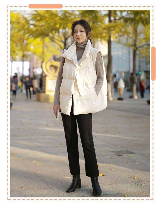 如果不喜欢太过臃肿的大衣和外套,不如切换成这种羽绒马甲,它可以把身体的热量基本上给留住,穿上后也会显得利落一些。如果内搭颜色比较深,外搭马甲选择浅色就好,可以让叠穿的视觉感更加明显,燕麦色针织衫打底,和奶油白色相结合,视觉感还是非常高级的。小黑裤和粗跟切尔西靴搭配,靴口收紧,裤口稍大,也是松紧一致不拖沓。