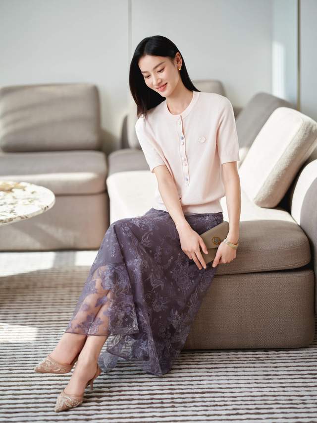 我们分析完了鞋子的选择技巧,再来看一看裙子如何穿,让自己看起来更显温柔大气,可选一件浅粉色的针织开衫,来配上这一条比较有女人味的紫色薄纱半身裙,温柔自显。