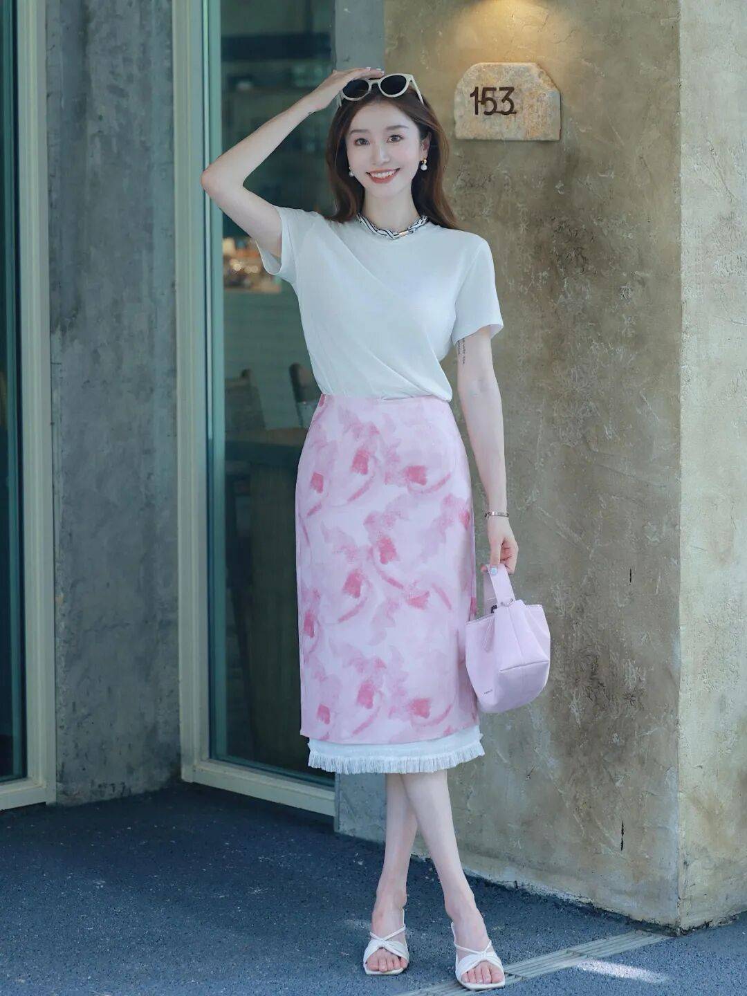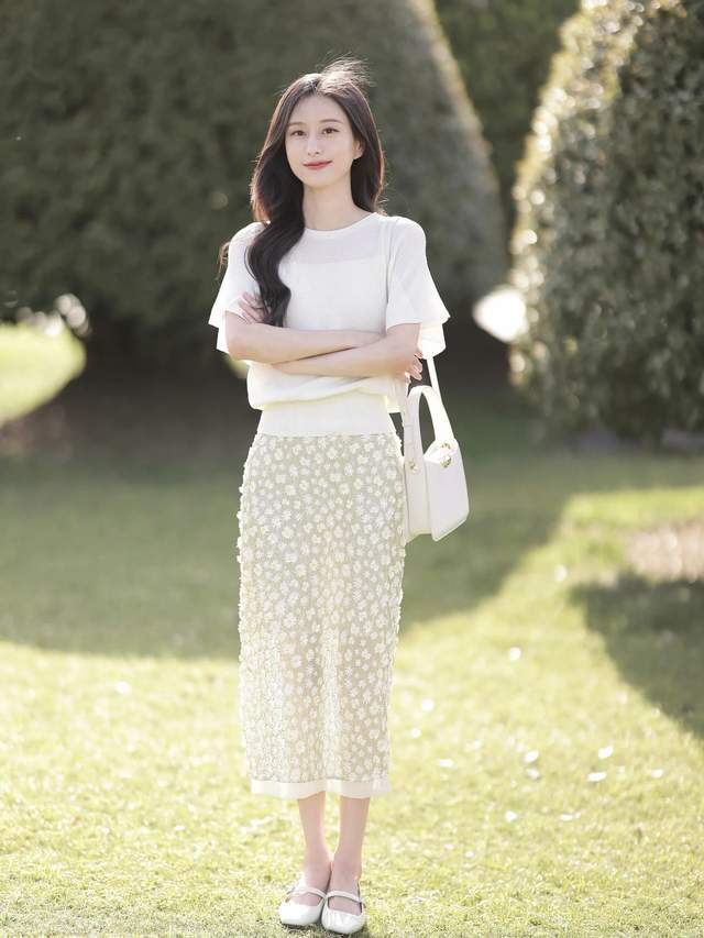 想让自己打扮美如初恋一般的气质,可选一件白色的上衣,配上印花刺绣设计的白色直筒半身裙,脚踩白色玛丽珍鞋,纯净的白使得穿搭者看起来更甜美。