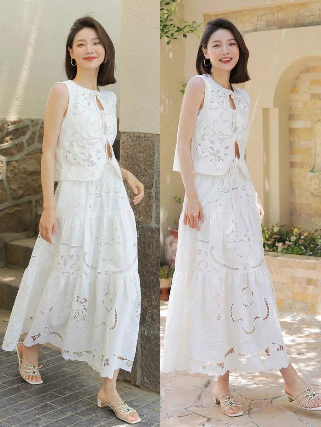 就好比上面用镂空设计的无袖上衣配同款设计版型的白色伞状半身裙。脚踩粗跟凉鞋,一身纯净的白,看起来高级精致,活力感满满。