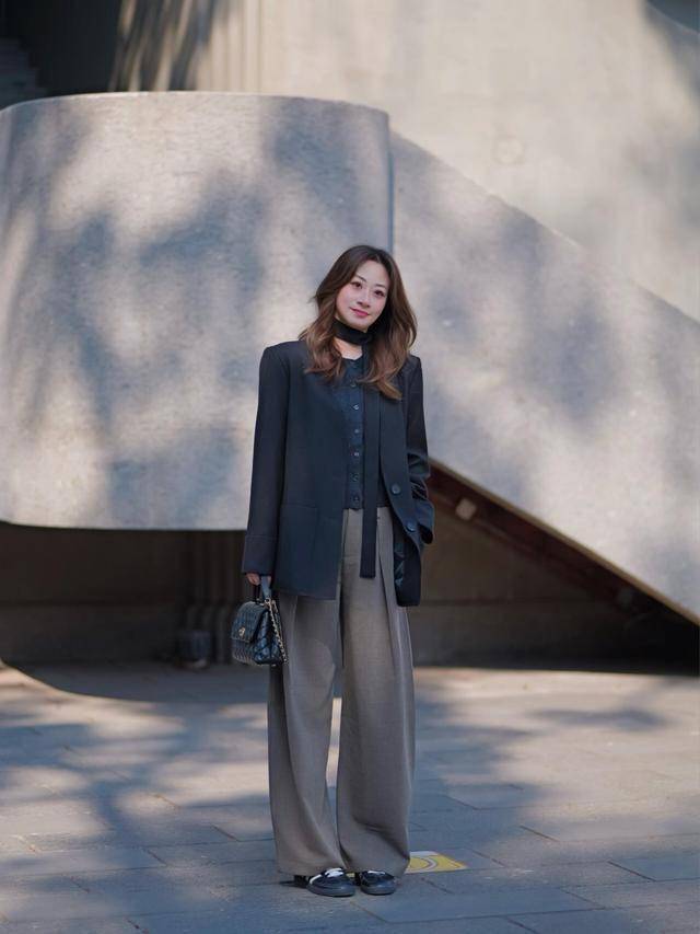 经典职场组合,内搭酒红真丝衬衫提亮肤色,棕色托特包增强质感。
