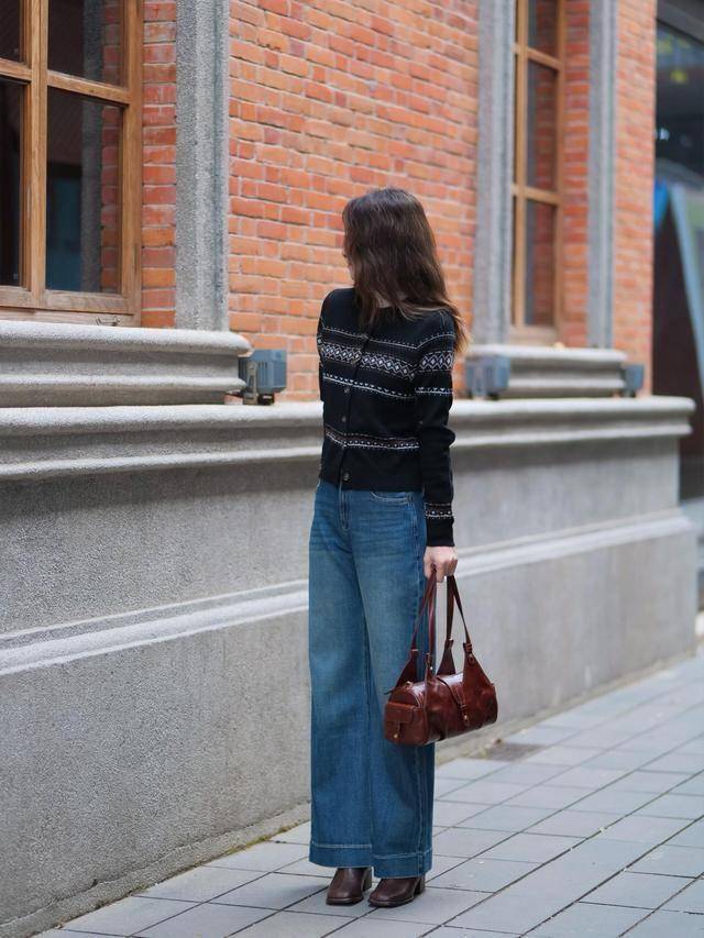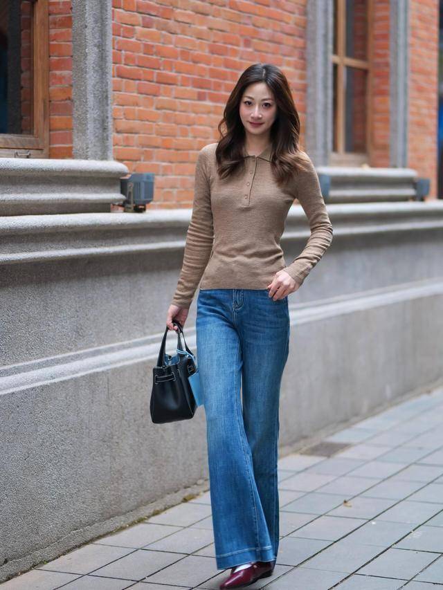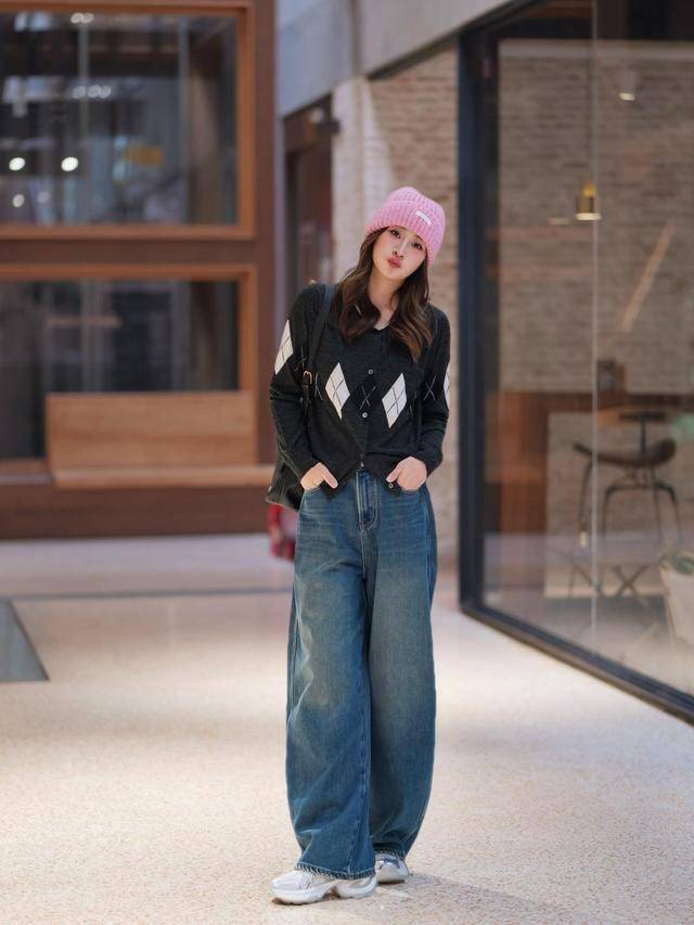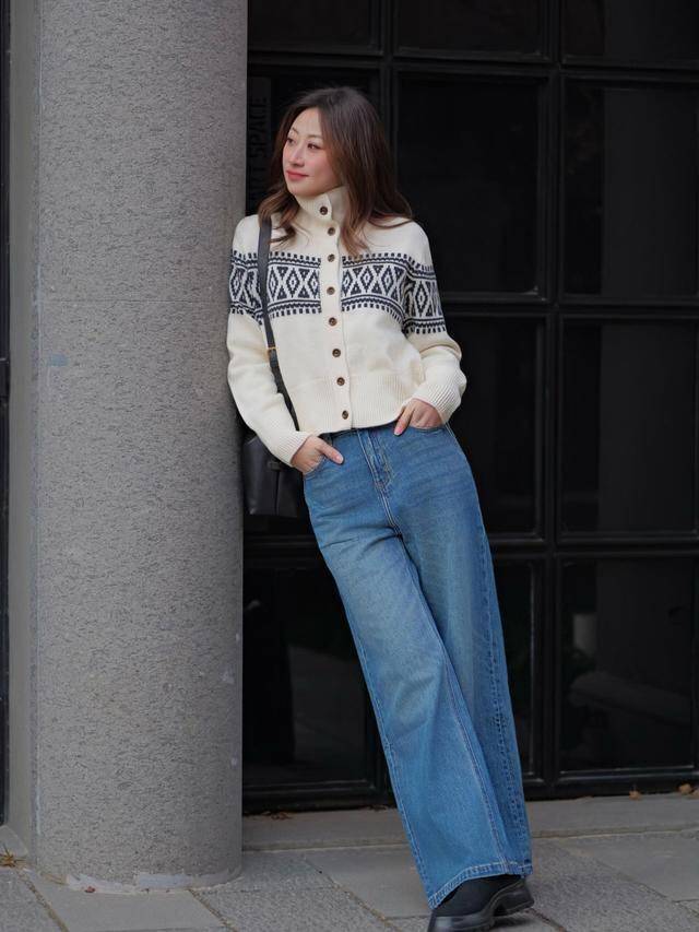 高领打底+菱格纹针织衫+微喇牛仔裤
