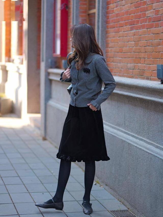 丝绒衬衫+毛呢背心裙+过膝袜
