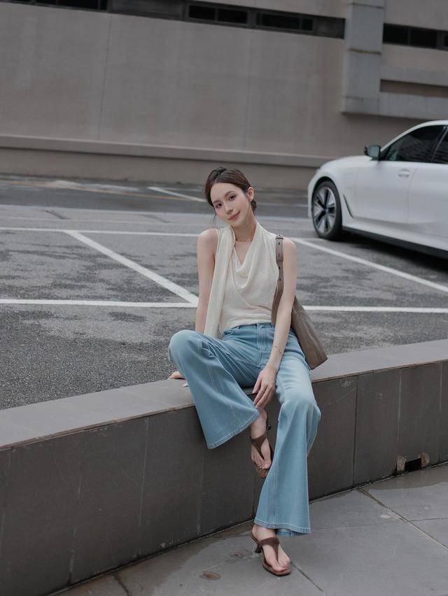 豆绿针织衫+白色阔腿牛仔裤+帆布鞋