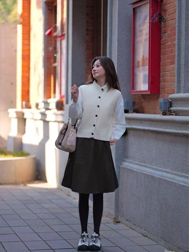 墨绿马甲叠穿,保暖显瘦,红色手提包点睛。