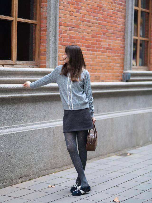 浅灰小香风套装+米白针织内搭