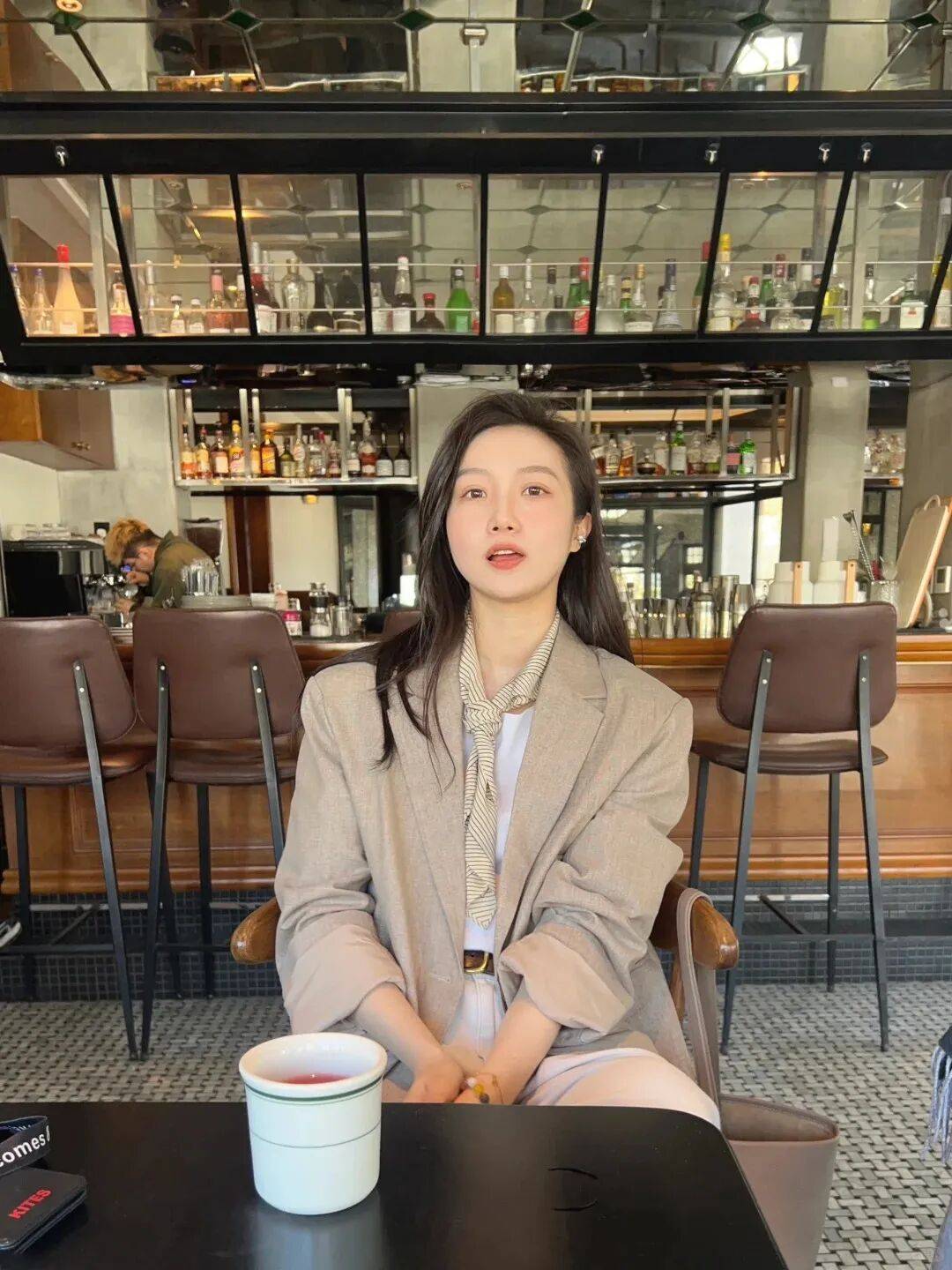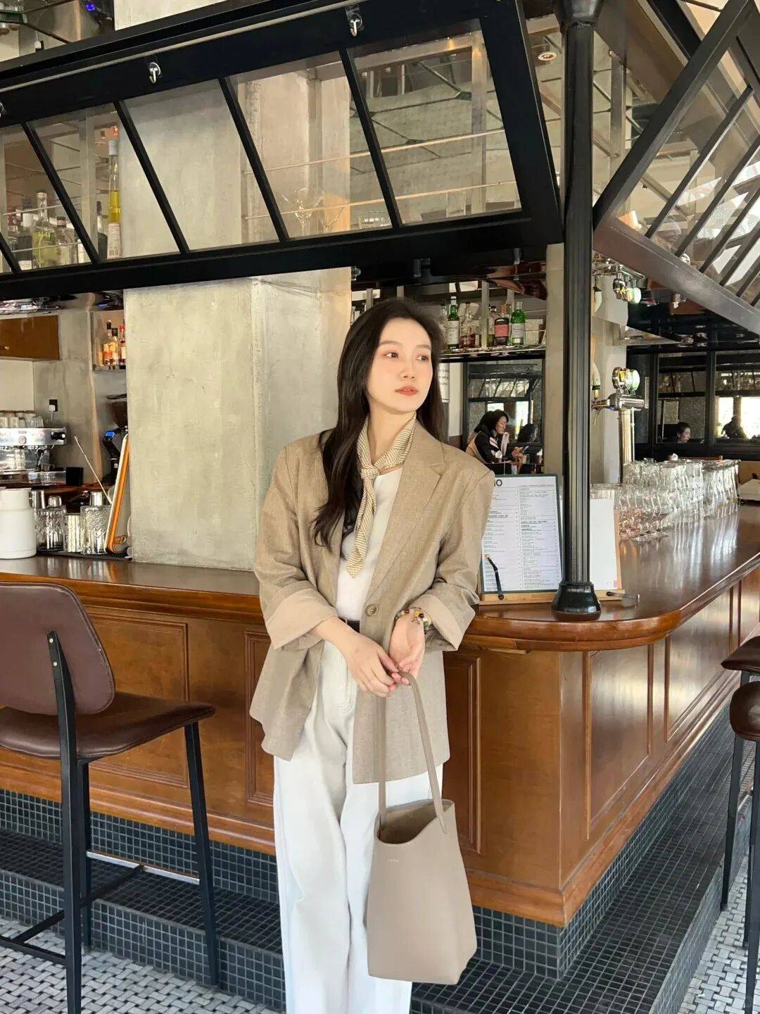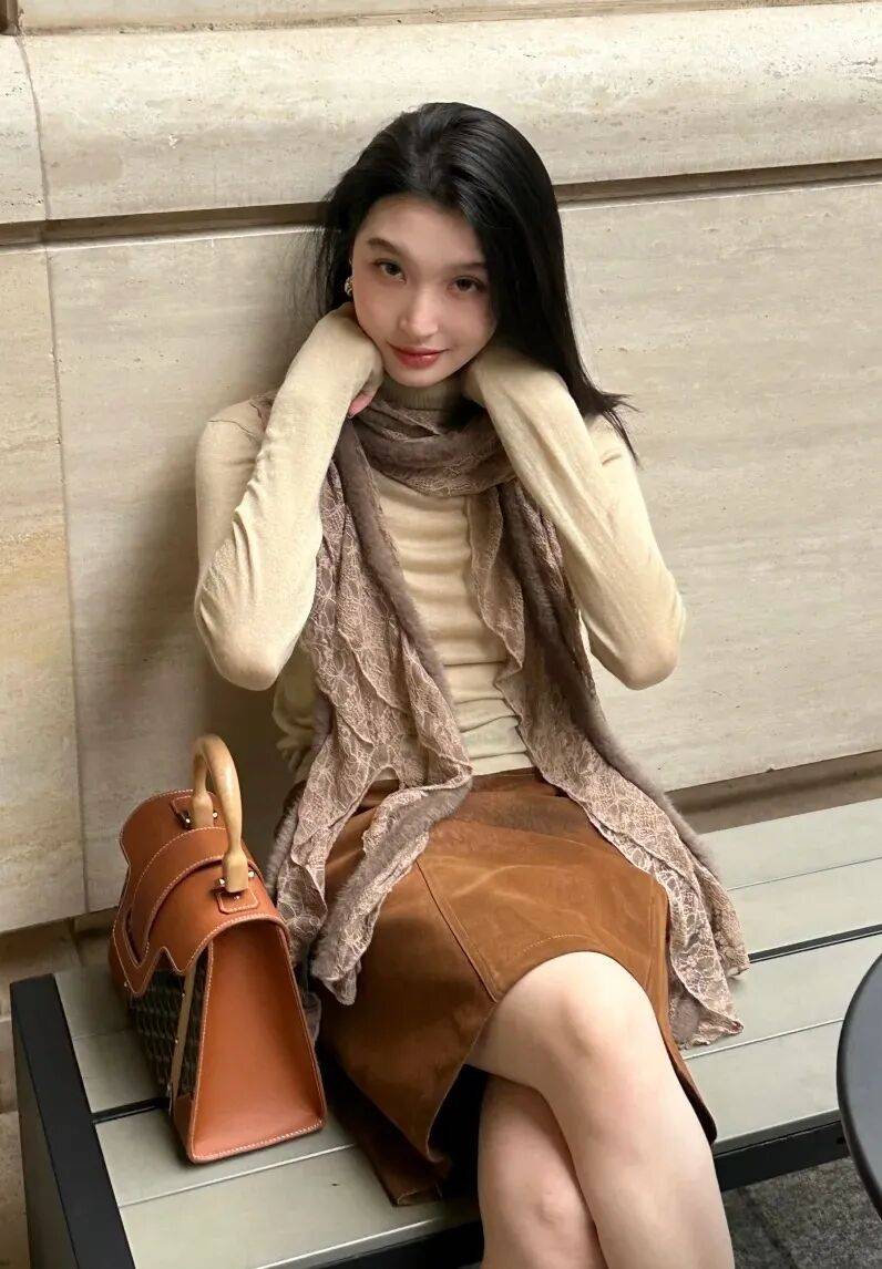 浅棕色西装+白色T恤+牛仔裤:浅棕色西装选软面料(比如棉麻),内搭白色宽松T恤(下摆扎进裤腰),下装配浅蓝色直筒牛仔裤(裤脚卷一点),脚踩小白鞋,像“刚从咖啡馆出来的文艺女”,休闲又时髦;