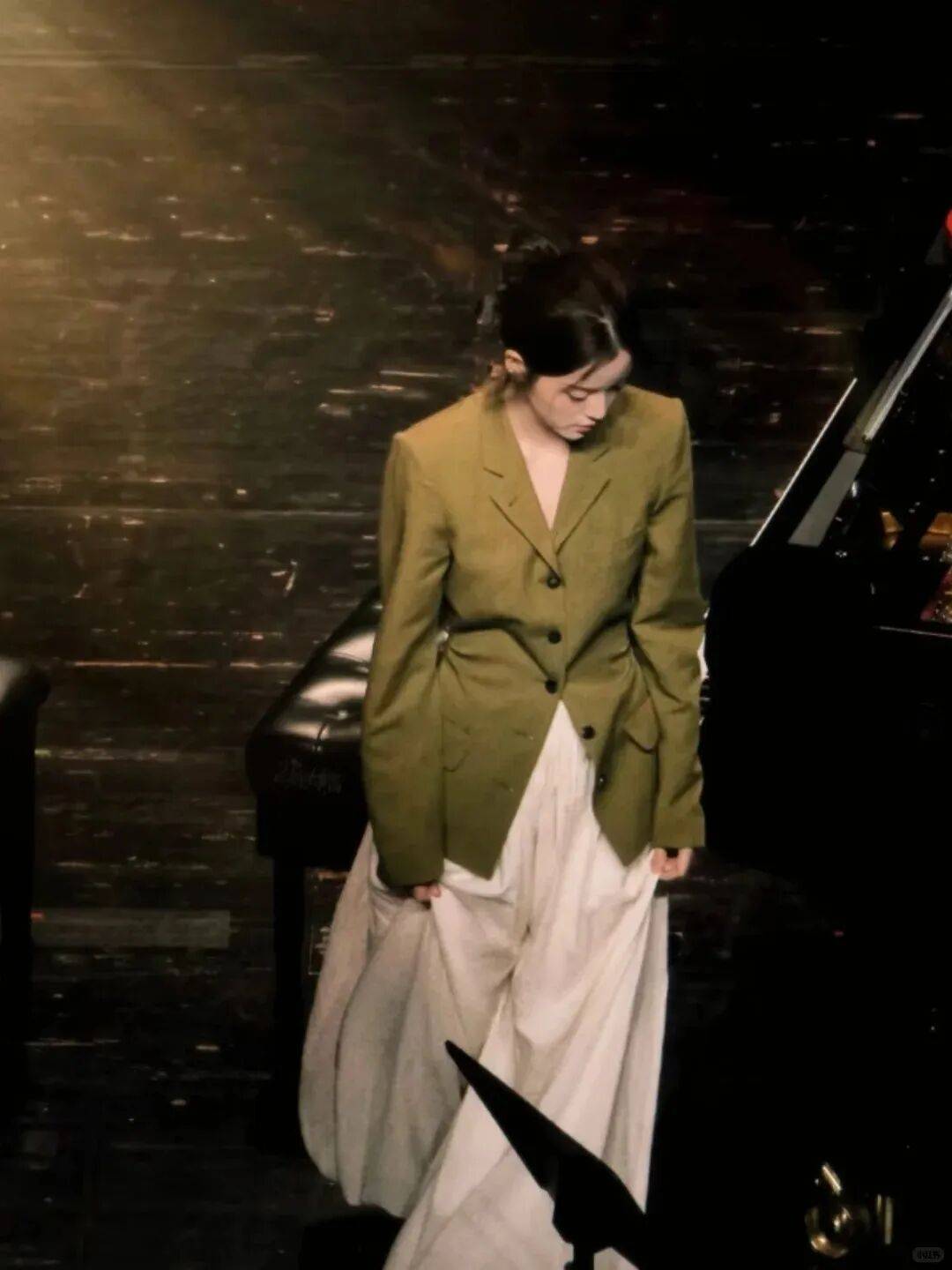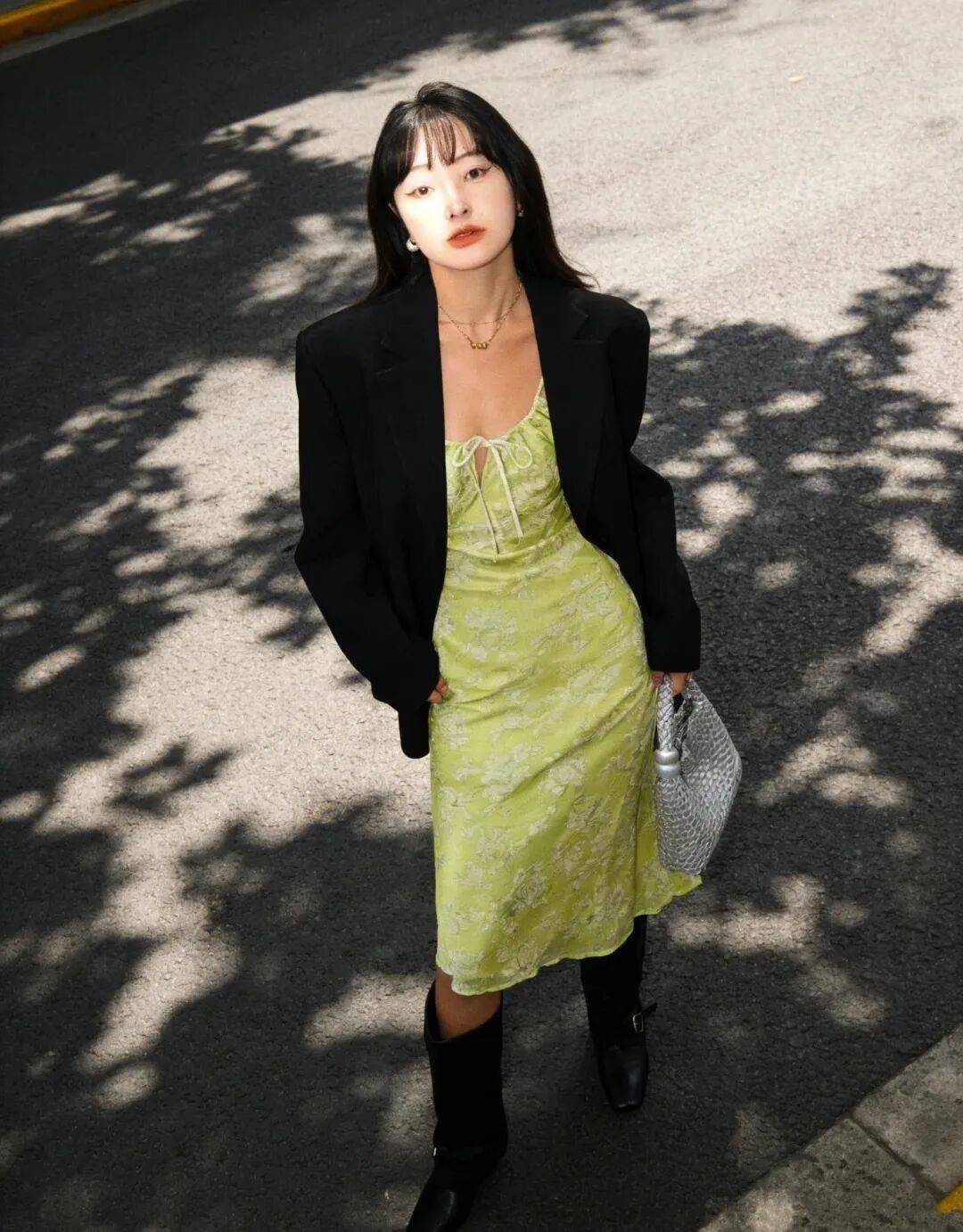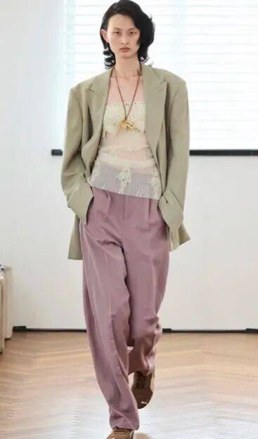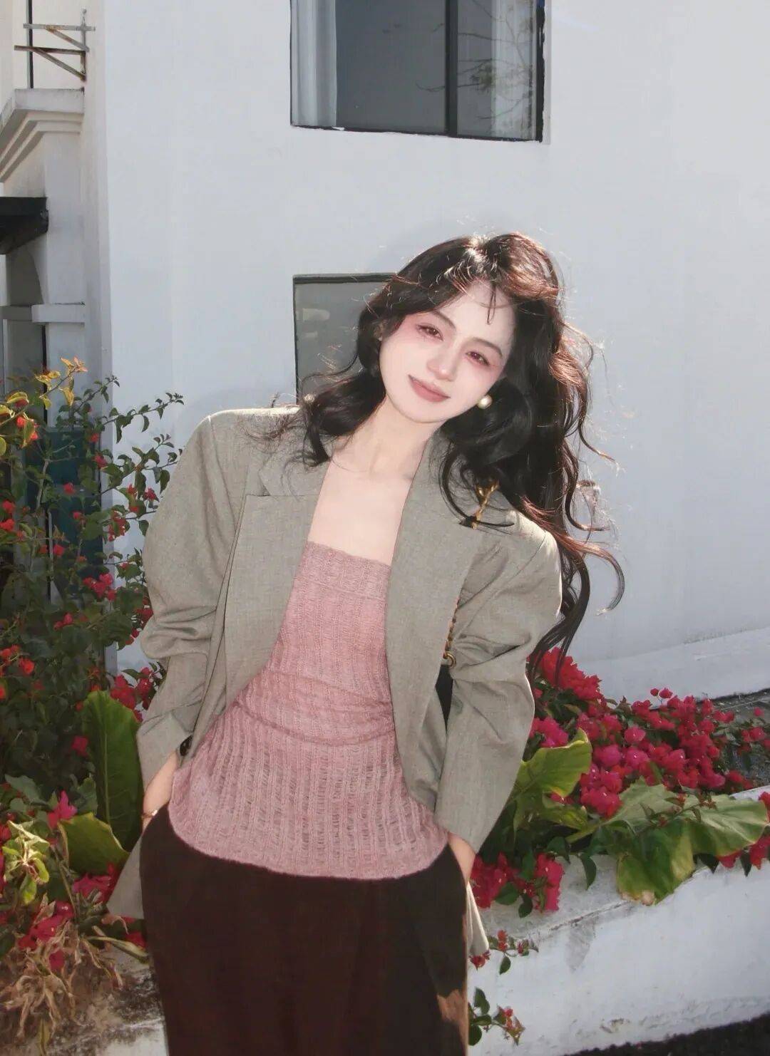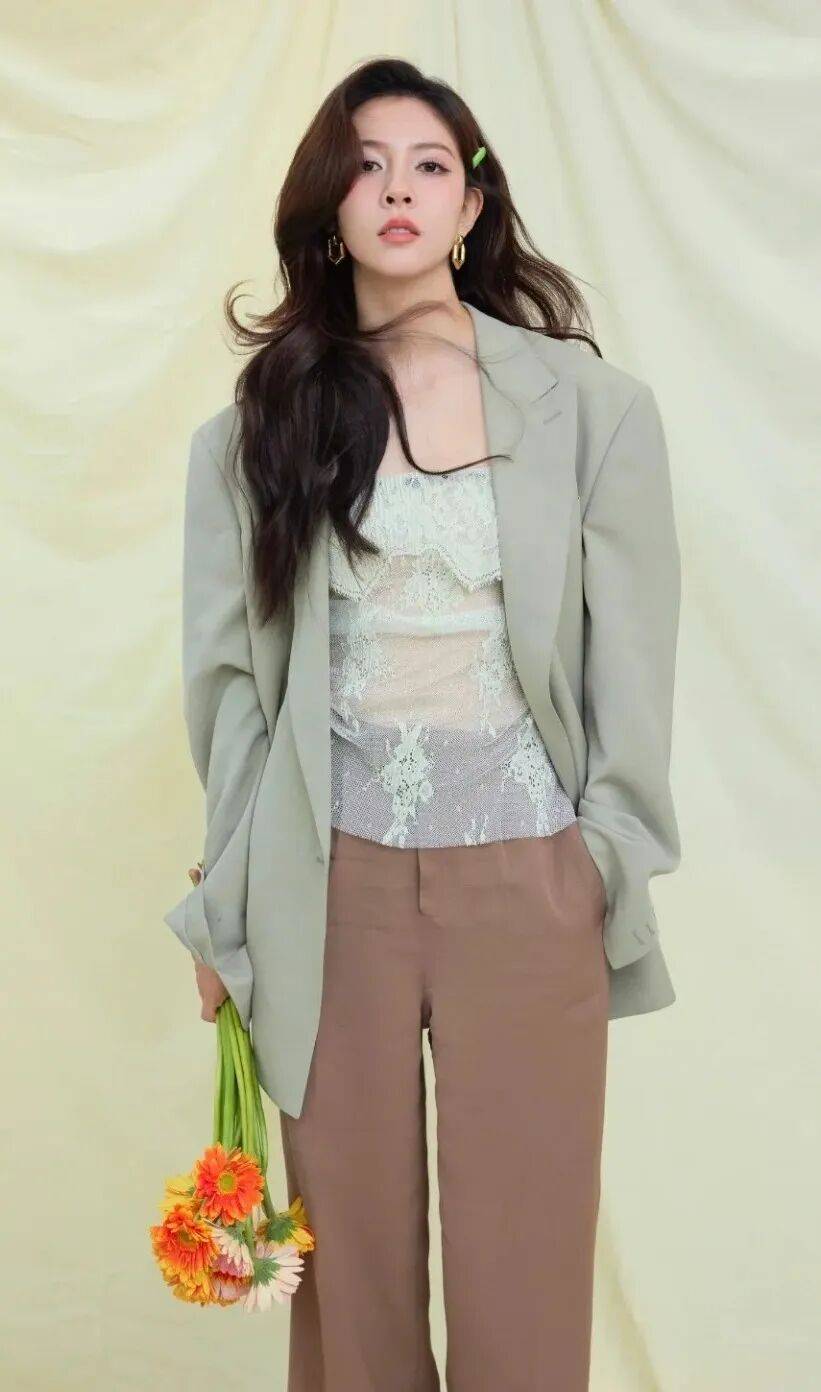 约会派对:选对比色或带点“温柔元素”,比如藕色西装+深蓝色丝质衬衫+白色烟管裤,配一对珍珠耳环,浪漫又高级;或者淡粉色西装+白色蕾丝上衣+淡粉色半裙,像“春日的樱花”,温柔到骨子里。