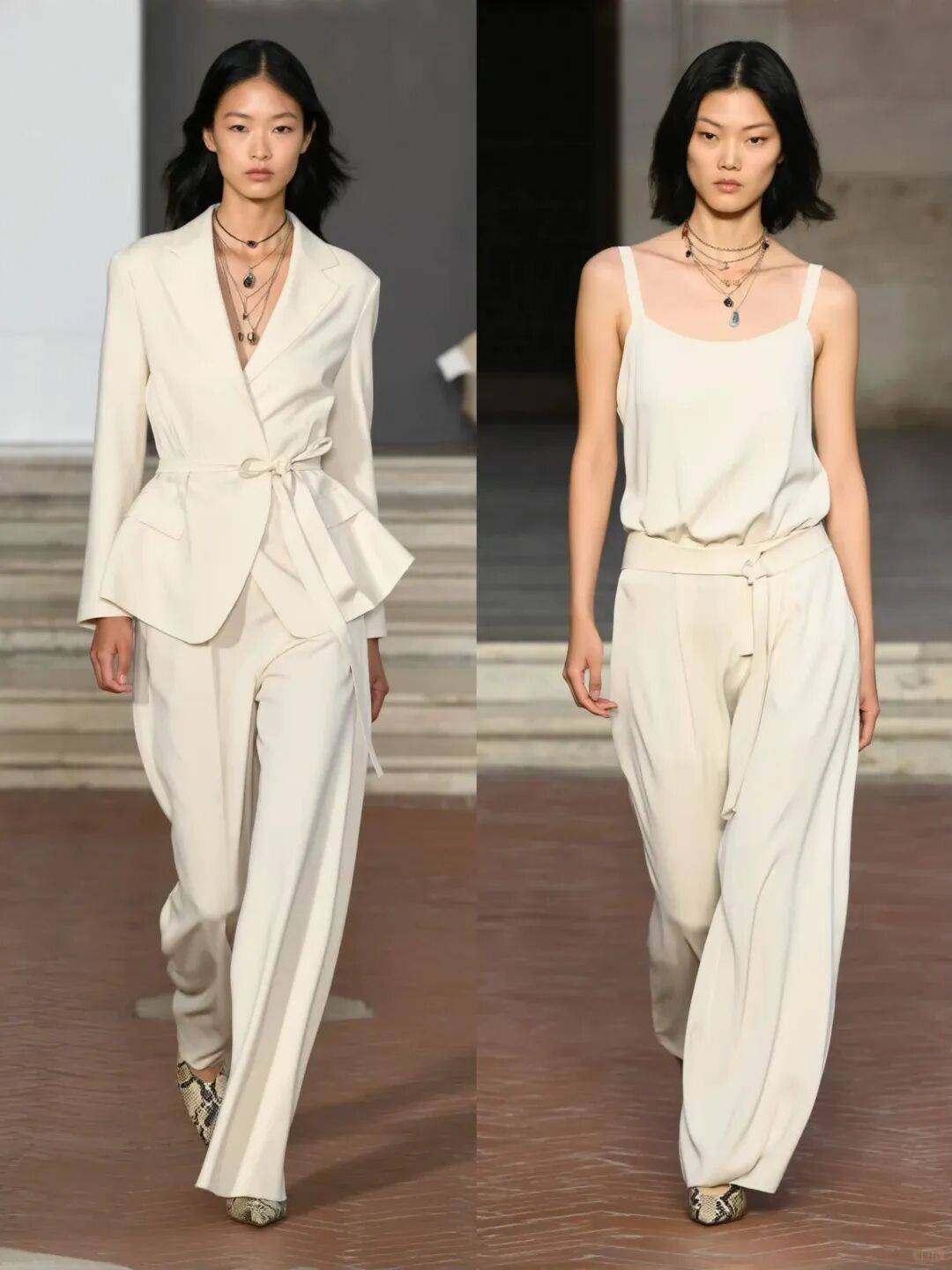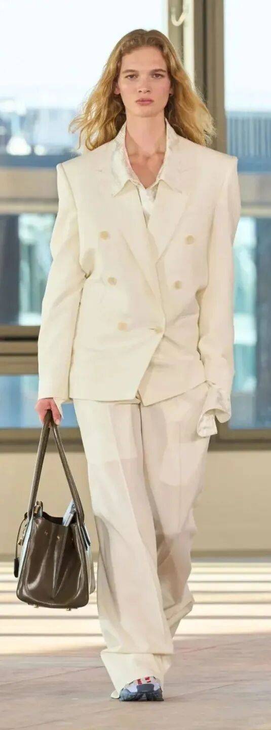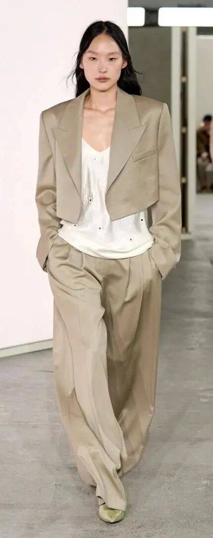 米白色西装+浅灰衬衫+米白色西装裤:米白色西装选宽松版型(但肩线要利落),内搭浅灰色棉麻衬衫(带点肌理感),下装配米白色直筒西装裤,脚踩浅金色高跟鞋,像“行走的云朵”,职场穿简约大气,日常穿也不沉闷。