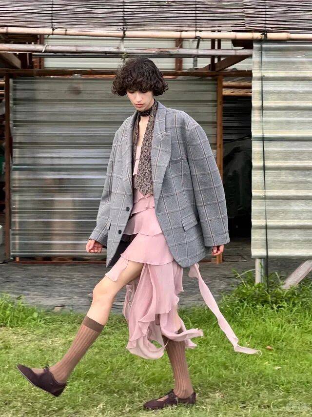 淡粉色西装+白色衬衫+灰色西装裤:淡粉色西装选H型版型(藏肉又显气质),内搭白色真丝衬衫(领口解开两颗扣,增加随性),下装配灰色直筒西装裤(面料选挺括的),脚踩黑色细高跟,像“职场里的优雅女性”,干练又不失温柔;