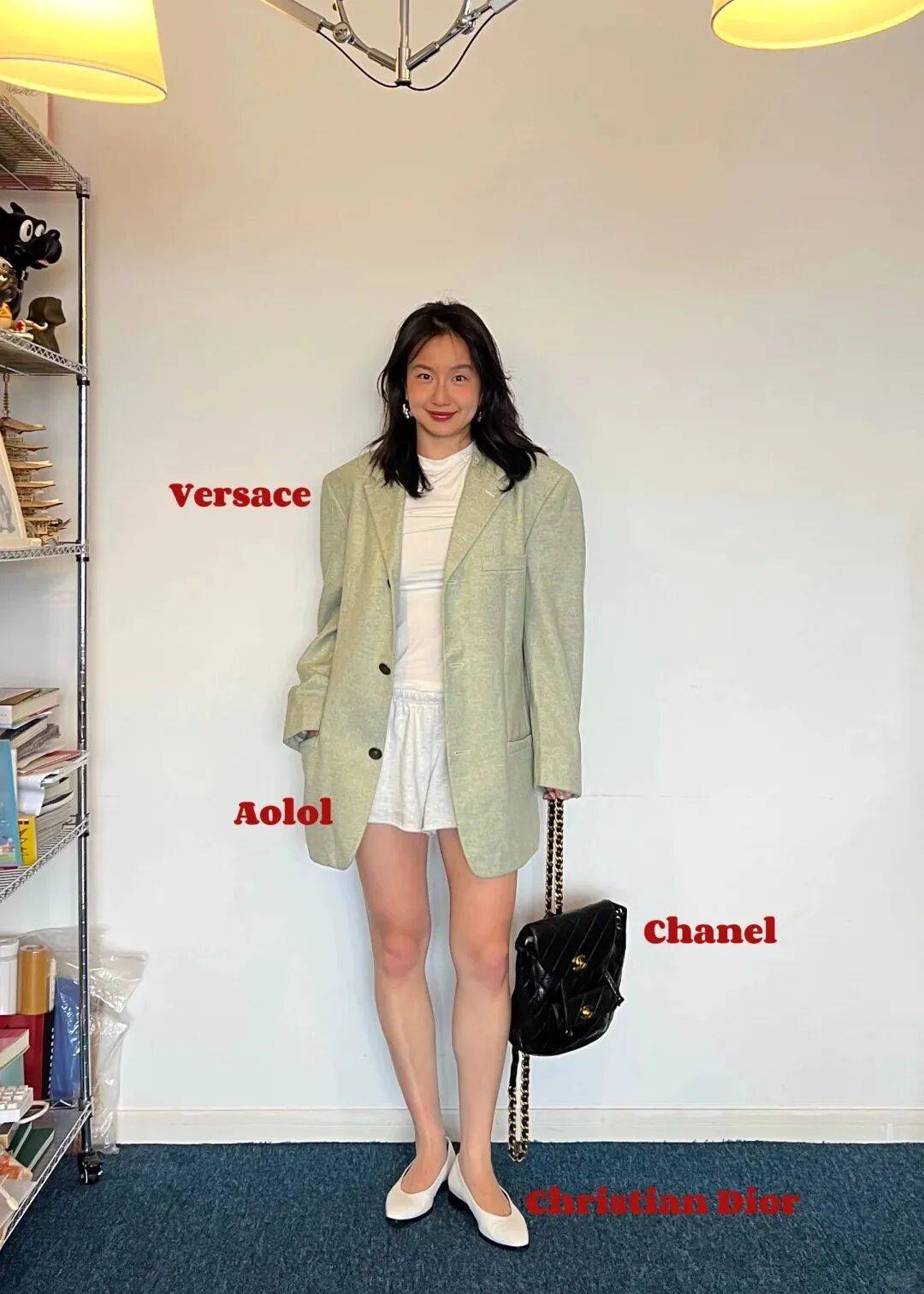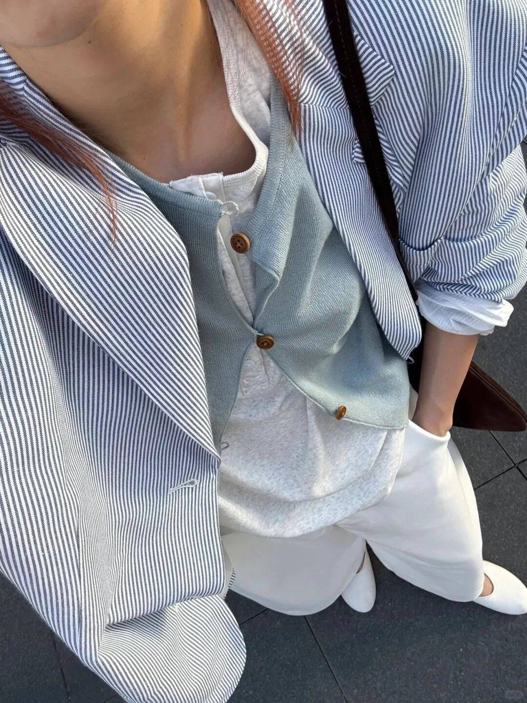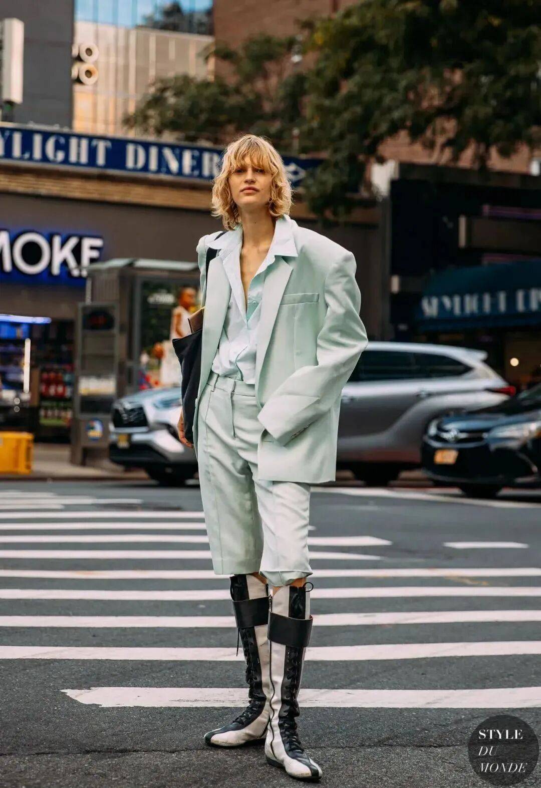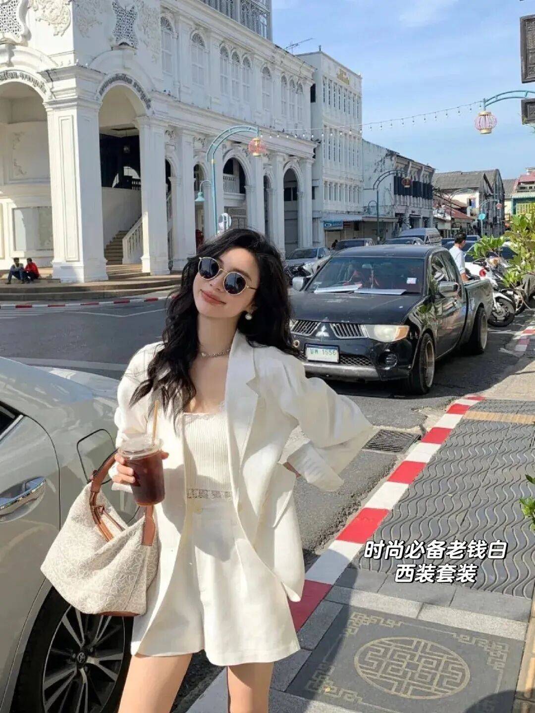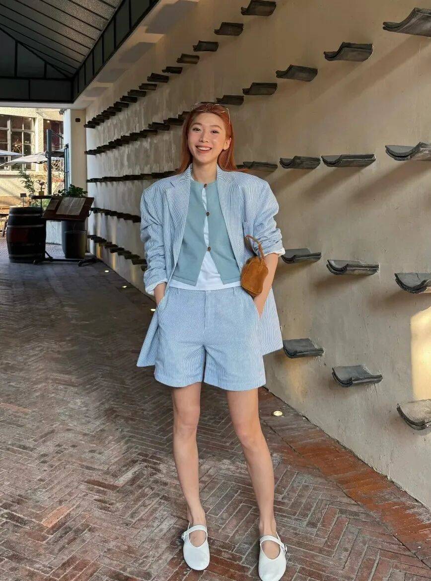 浅色系西装不一定是“职场专属”,用“休闲单品”混搭,能穿出“随性又高级”的感觉。