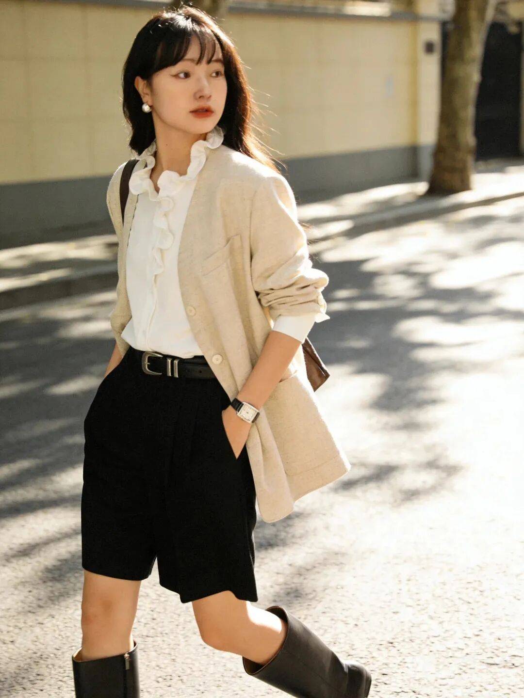 配饰:用“小而精”的配饰提升高级感,比如珍珠耳环、浅金色项链、米白色手袋,避免“夸张的饰品”,否则会抢了西装的风头。