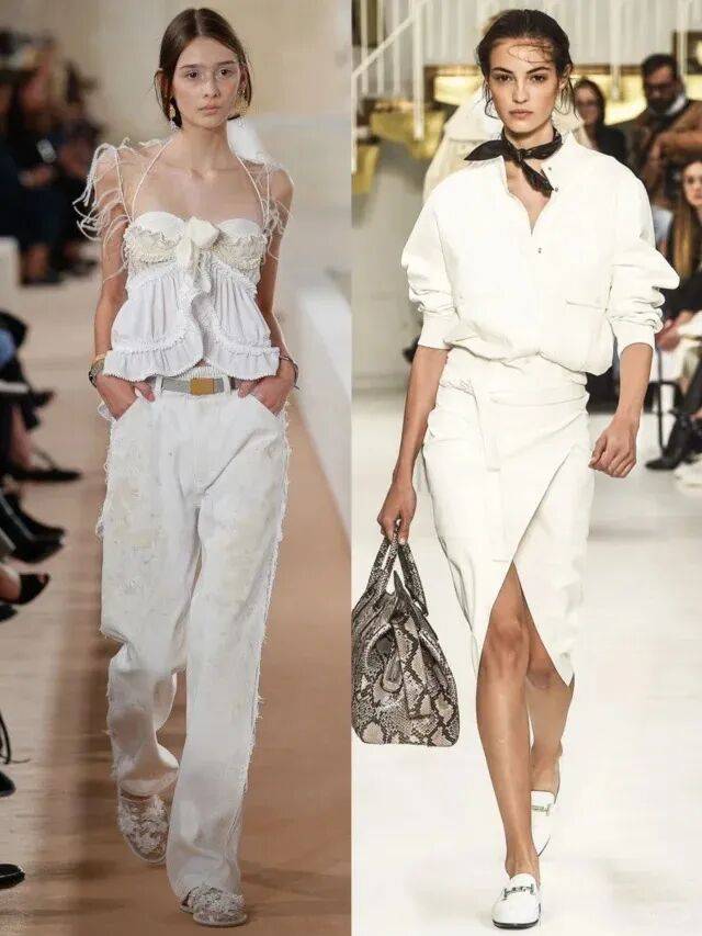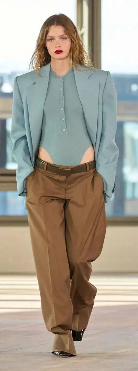 藕色西装+深蓝色丝质衬衫+白色烟管裤:藕色西装的柔和,搭配深蓝色丝质衬衫的“冷静”,下装用白色烟管裤平衡,脚踩浅金色高跟鞋,像“春日的蓝天与晚霞”,高级又有记忆点;