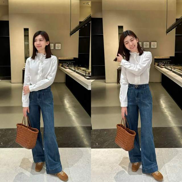 身材偏瘦的女生不想让自己的穿搭看起来过于干瘪的情况下。选择微宽松的 V 领小众衬衫搭配上微喇叭的牛仔直筒长裤。