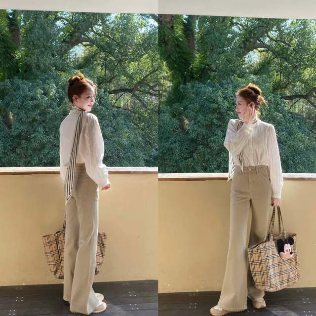 例如上面卡其色的微喇叭长裤,搭配上白色的小众衬衫,扎得高高的丸子头发型,这样的穿衣打扮真的很显利落,既显高又显瘦,不压个子,轻松拿捏,一眼心动的春日氛围。