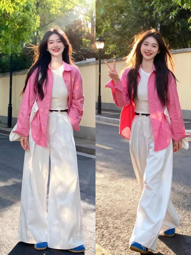 若是偏爱少女的穿衣风格,不妨可以选择粉色的衬衫,搭配上白色打底衫和一条白色的阔腿长裤,脚上穿的蓝色德行训鞋,粉色衣服穿在身上,少女气息自显。