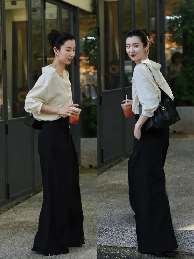 若是自己长相偏成熟,骨架比较大的情况下,我们不妨可以选择像上面这一身穿法,用浅黄色的微宽松衬衫搭配上一条黑色的阔腿长裤。