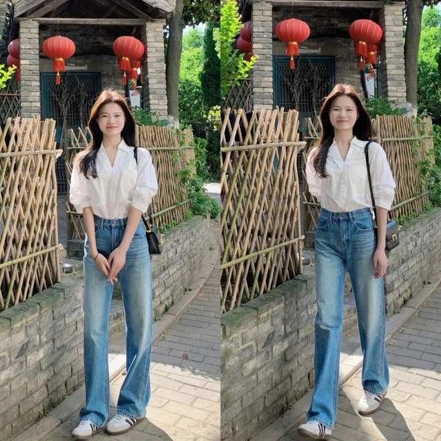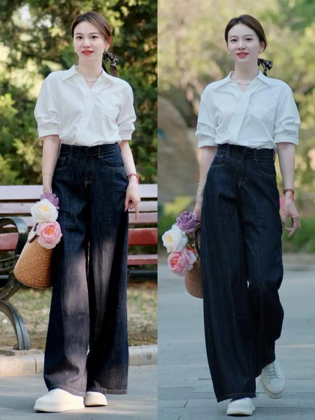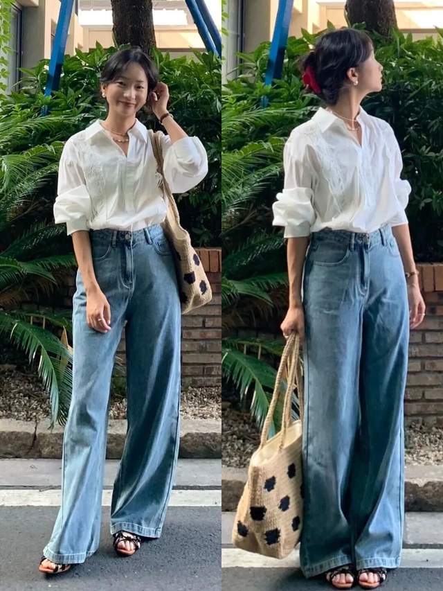 例如上面这一套穿搭,直接选择白色的衬衫搭配上牛仔阔腿裤,脚上穿的一双小白鞋,简洁利落