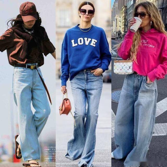 春日出游,简单的T恤衫与卫衣都可以搭配一条浅蓝色的牛仔阔腿裤,都会有一种特别轻松自在的休闲风格,而且穿起来又非常舒服。