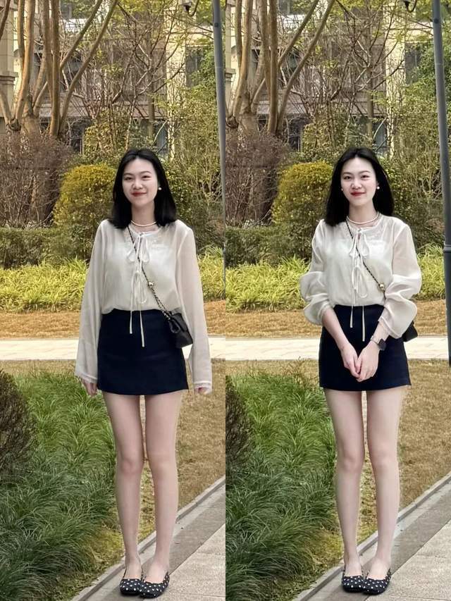 身材不同,年龄不同,气质不同,自然选择的穿衣风格有一定的区别,例如上面这位 00 后的美少女,就用了一件薄纱的小众衬衫内搭小吊带,结合一条黑色的 A 字短裙。