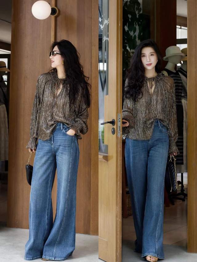 个性很洒脱的女生,可以试试黑色衬衫搭配丹宁蓝牛仔阔腿裤,酷感十足又显高级。