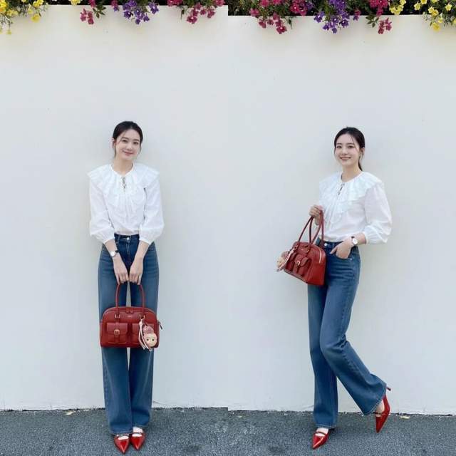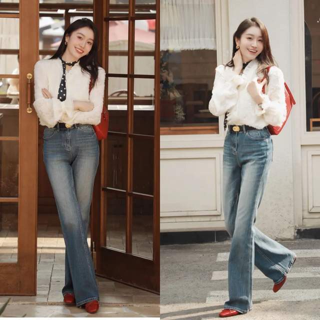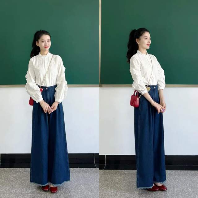 个子小巧的女生可以选择一件木耳边设计的白色衬衫,搭配上高腰收腰款的蓝色牛仔阔腿裤,脚穿一双红色的玛丽珍鞋,肩膀上挎着红色的包包,和鞋子形成呼应,扎着高高的马尾辫,发型甜美又可爱。