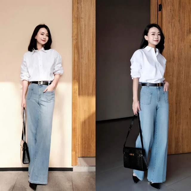 最主要的还是看你喜欢什么样的穿衣风格,不必盲目跟风,找到适合自己的才是最好看的穿搭。例如上面用白色衬衫搭配上蓝色牛仔阔腿长裤,脚上穿的一双小白鞋,优雅利落,通勤穿搭格外的得体耐看。