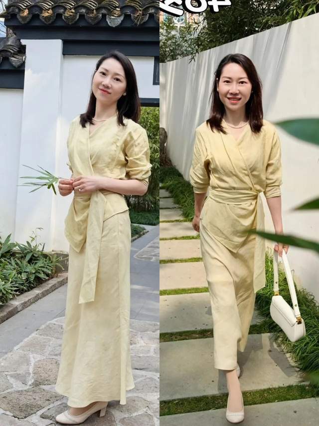 若是你比较偏爱优雅的女人味穿衣风格,我们可以选择一套鹅黄色的衬衫裙装,搭配一双白色的粗跟单鞋,穿的时候再把上衣的衬衫腰带系起来,就能形成高腰线,既优雅又得体大方。