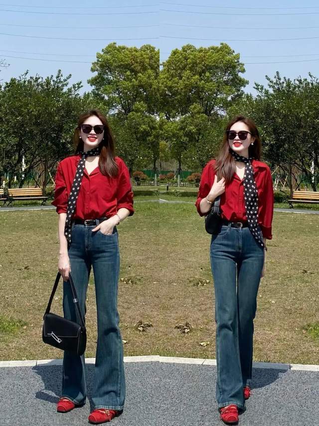 若是偏爱朝气蓬勃的穿衣风格,可以选择一件红色的衬衫,搭配上蓝色的牛仔微喇叭长裤,脚穿一双红色的德训鞋,正好和上衣色彩形成呼应,让整体配色找到了一个平衡点。