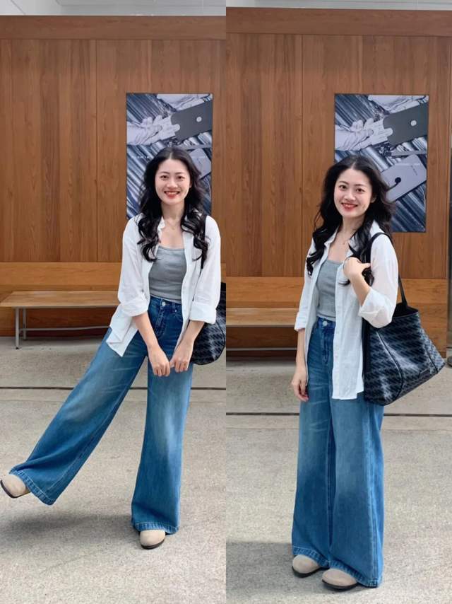 日常的普通素人直接选择一件白色衬衫,搭配上灰色的打底衫,脚上穿了一双小白鞋,结合蓝色牛仔阔腿裤,微胖女生这样打扮既时尚又干练,穿去上班,逛街,约会,出门旅游,拍照都很有氛围。