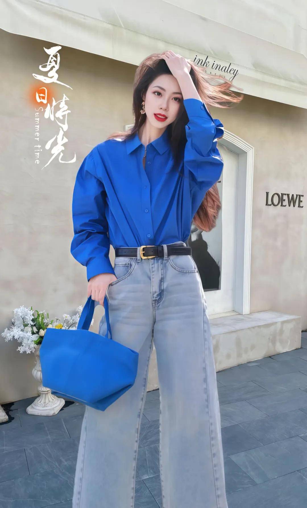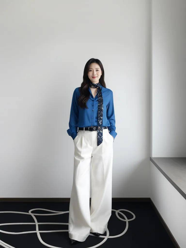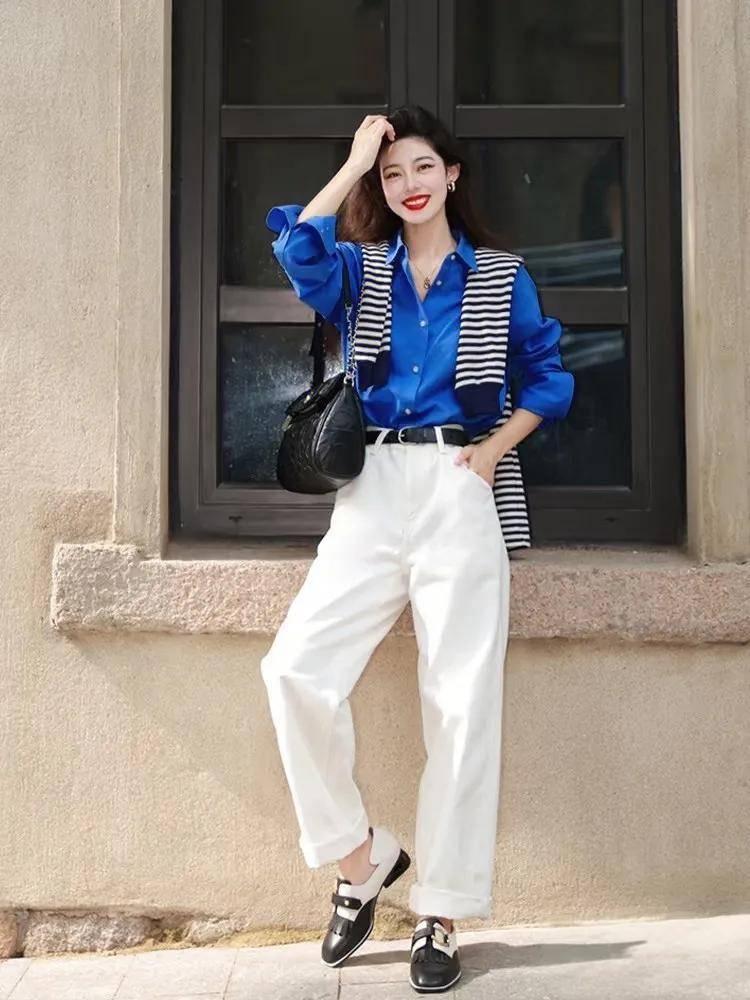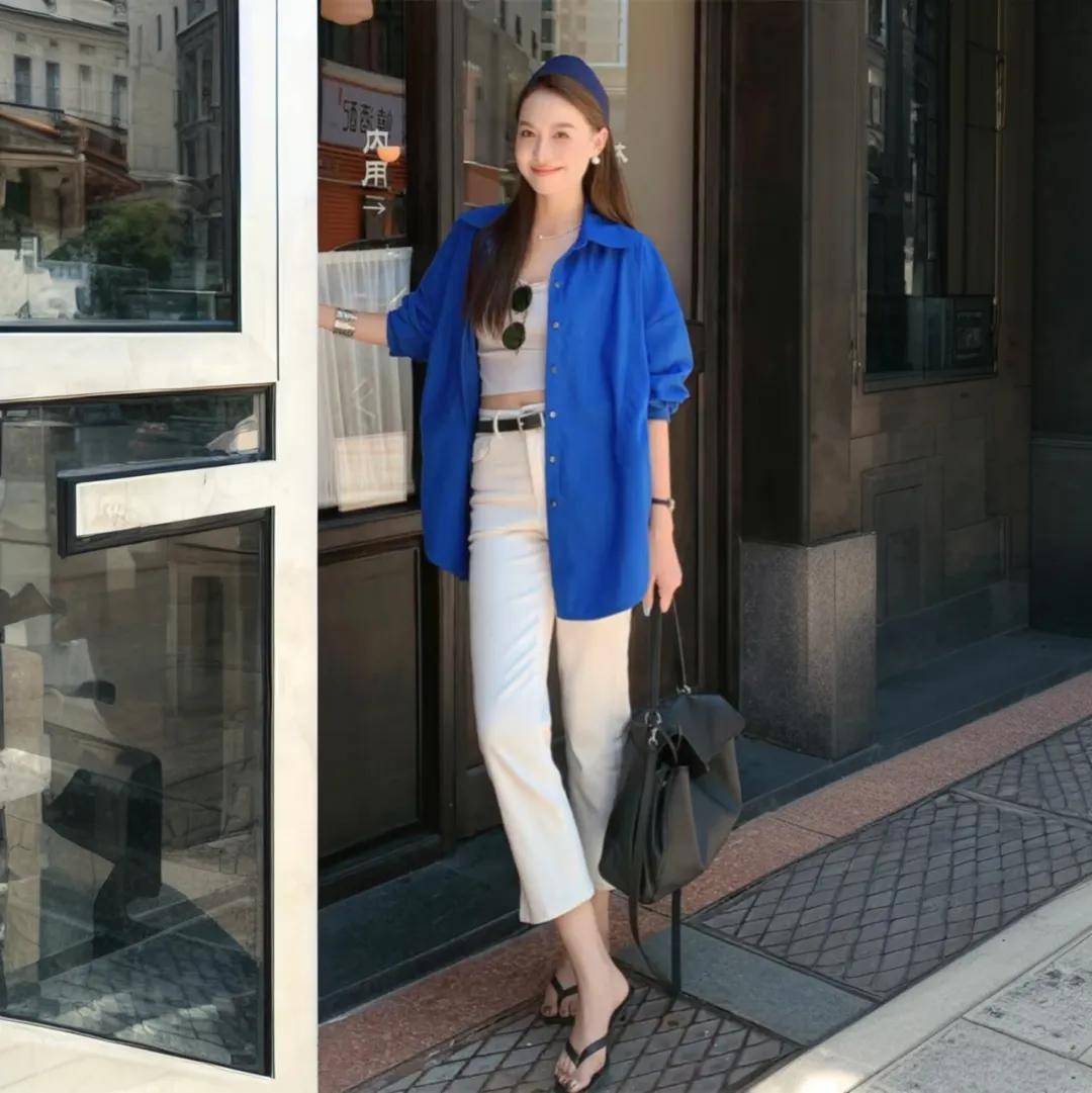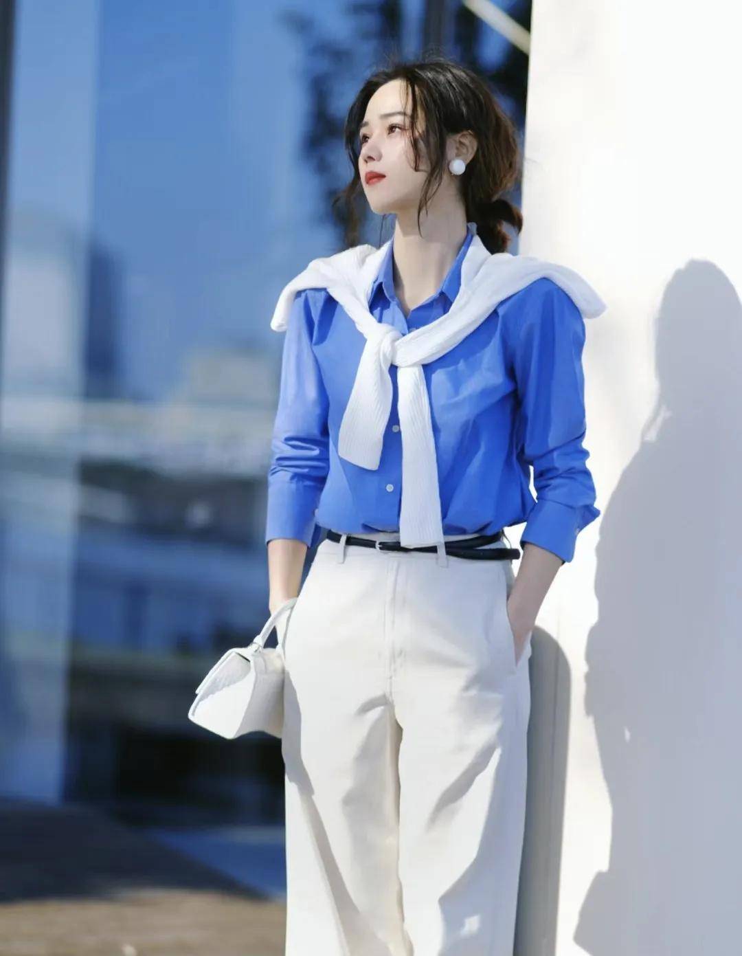 一件宽松的蓝色衬衫,搭配一条垂感良好的白色直筒裤,慵懒中透着干练。