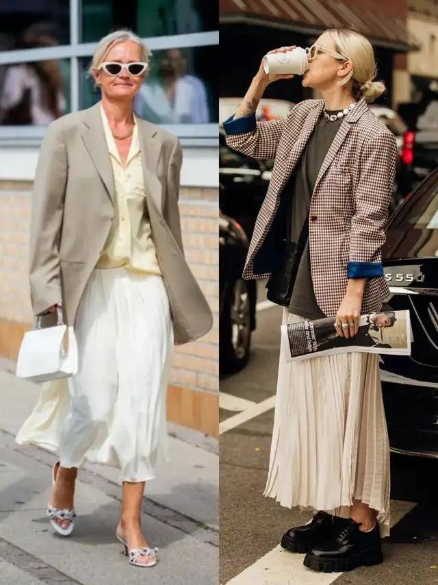 西装外套与半身裙本就是衣橱里最省心又能穿出彩的衣服单品。利落剪裁的西装穿在身上,整个人立刻精神挺拔,过膝不过脚踝的伞裙,温柔藏起胯宽腿粗的小烦恼,包容又显瘦。